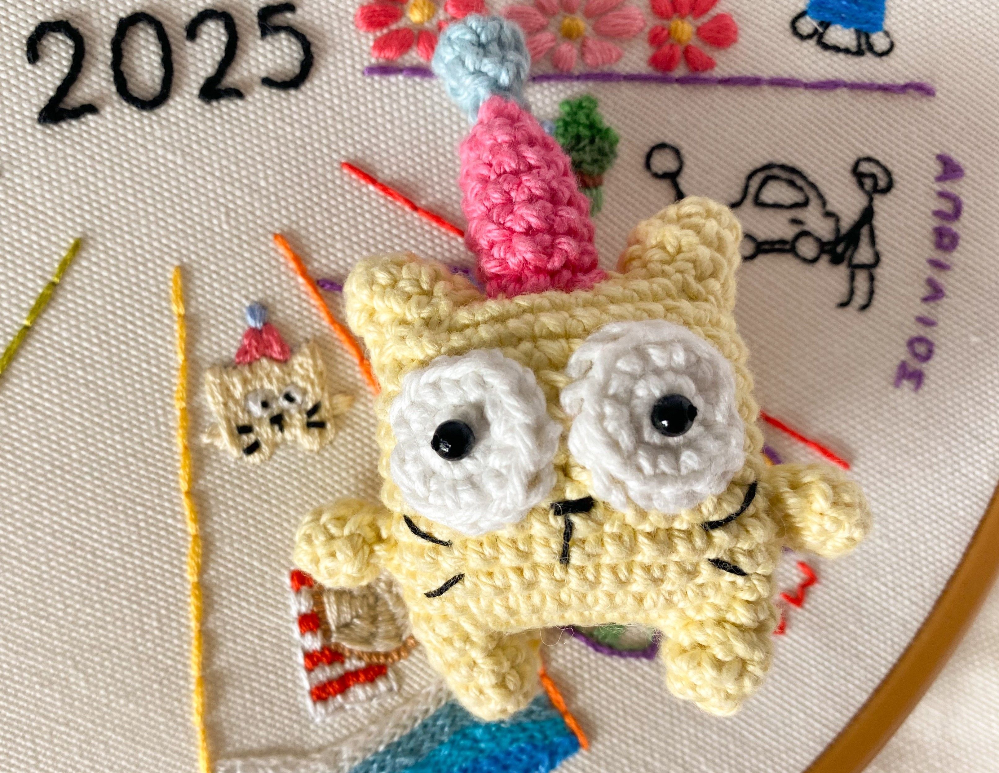 I'm really scatty; I keep forgetting to take photos of the process. So, the first photo that I took was when I had filled the first six months of the year. I tried to doodle something that would remind me of the most important moments of each month. If you're wondering why we're carrying a car in April, it's because that month, both our cars broke down just a few days apart. Although the first months were rather demanding, from May on, I tried to make more space for creativity. In June, I tried to embroider the amigurumi cats that I was crocheting at that time.