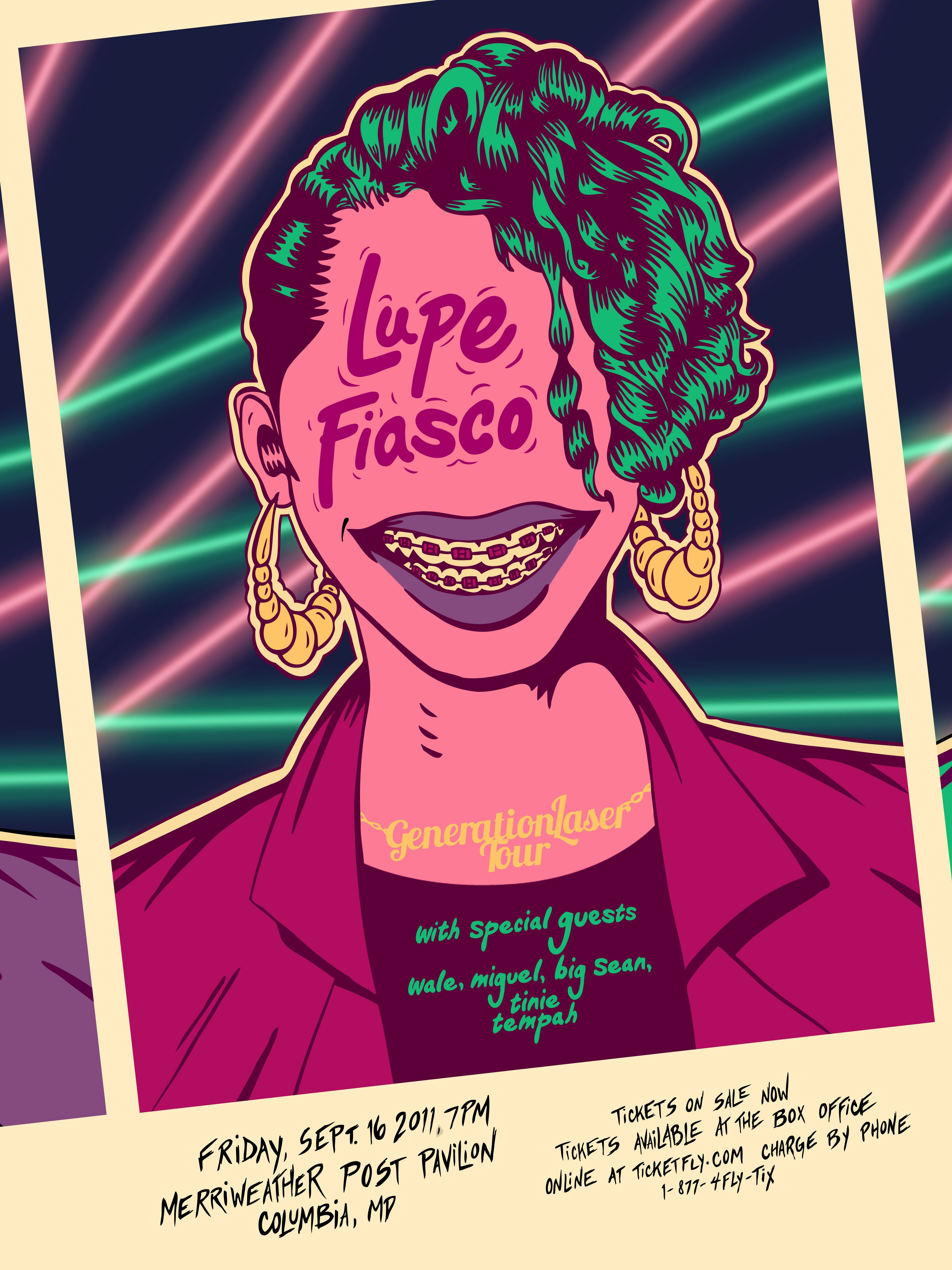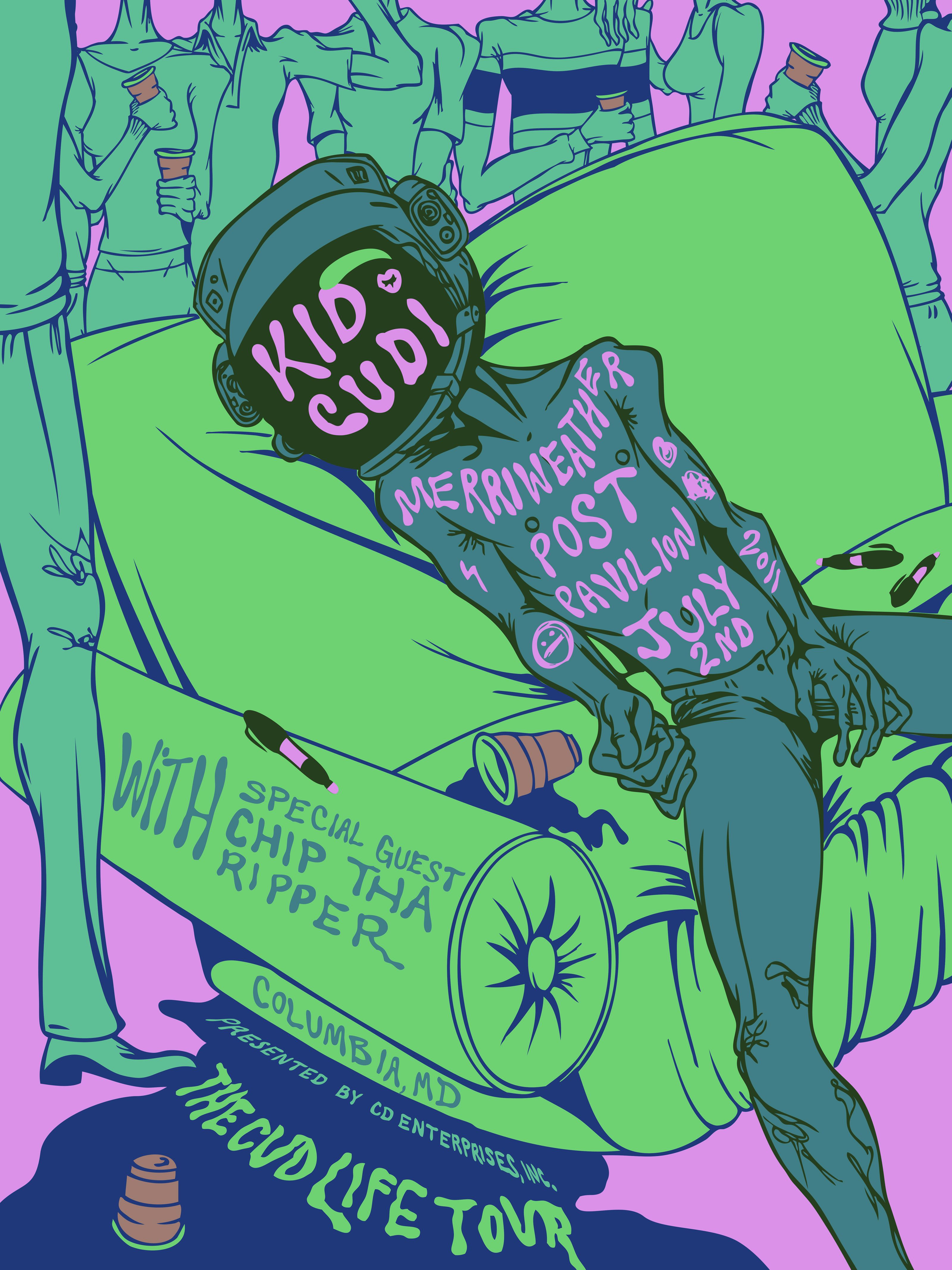 Concert poster for rappers Kid Cudi, while on his The Cud Life tour and Lupe Fiasco while on his Generation Laser tour.