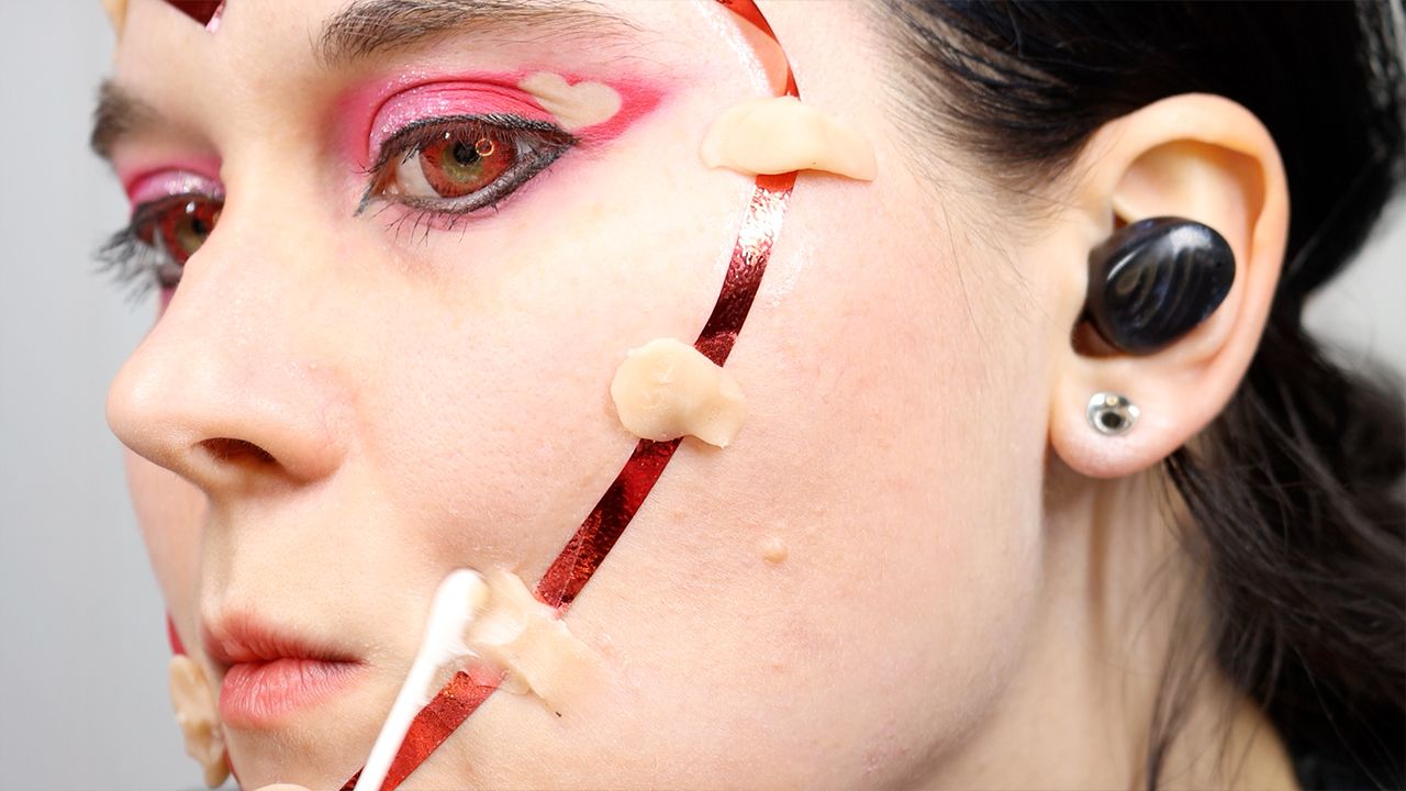 Mehron Synwax (scarwax), Adhesive (medical grade acrylic adhesive), Primer, Foundation, Pink eyeshadow, Heart pimple patches, Fwee Blush.