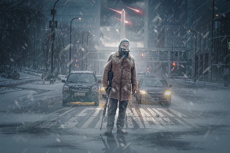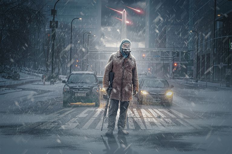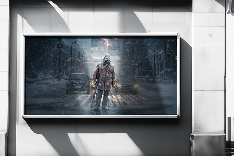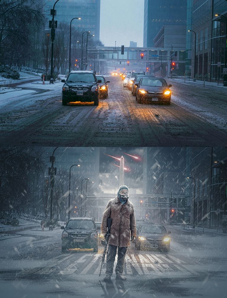 My inspiration also comes from posters of well-known post-apocalyptic or dystopian films, such as The 5th Wave, Peninsula, I Am Legend, The Walking Dead, in which devastation and desolation are usually shown as a background for the main characters to add drama.