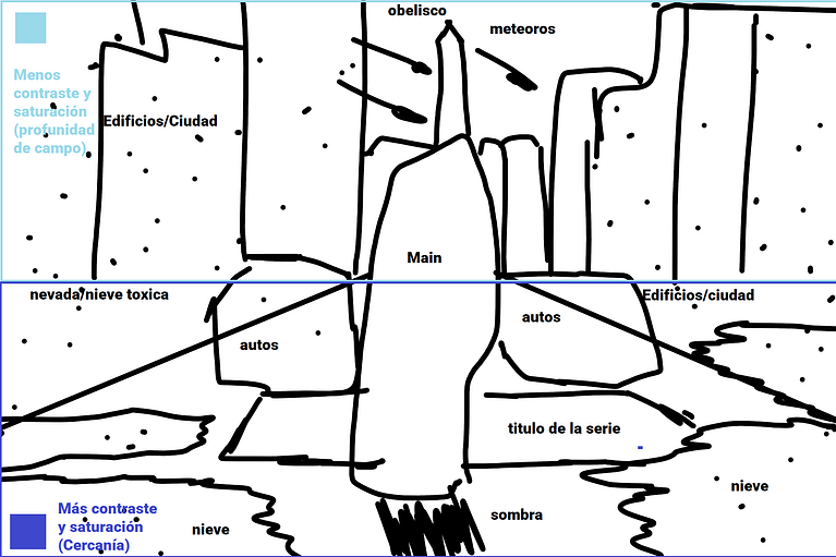 In my case, based on the examples taken into account for my composition (see moodboard) I drew a color palette inclined towards cool tones, taking into account that one of the main protagonists in the Saga of El Eternauta is the toxic snow, and the desolation that it brought with it.