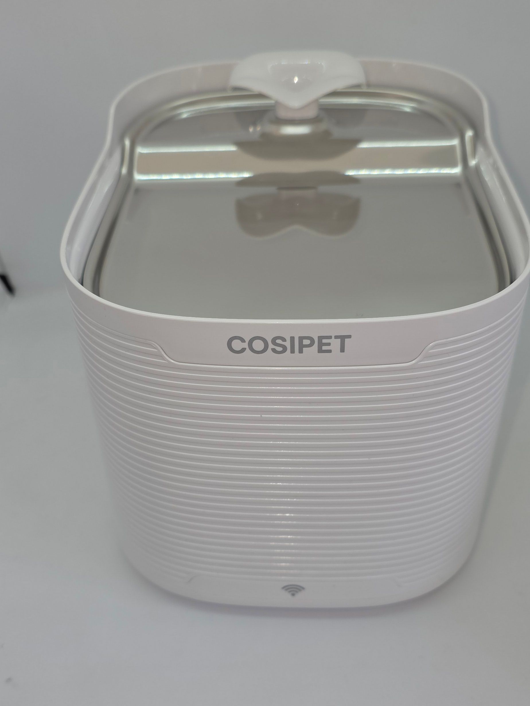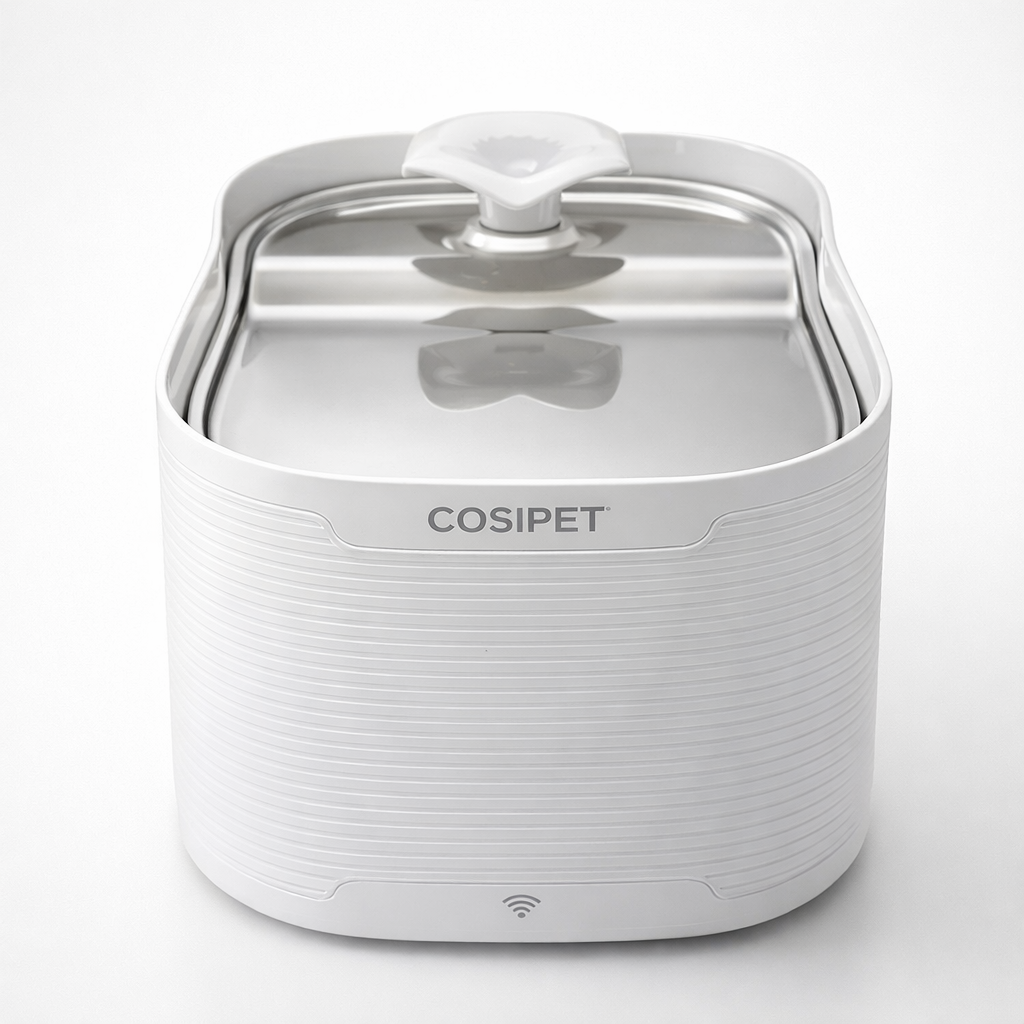 The pet water fountain must remain 100% identical to the reference image in shape, size, proportions, materials, color, buttons, edges and details.