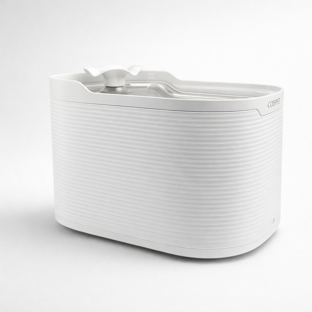 The pet water fountain must remain 100% identical to the reference image in shape, size, proportions, color, materials, buttons, edges and details.