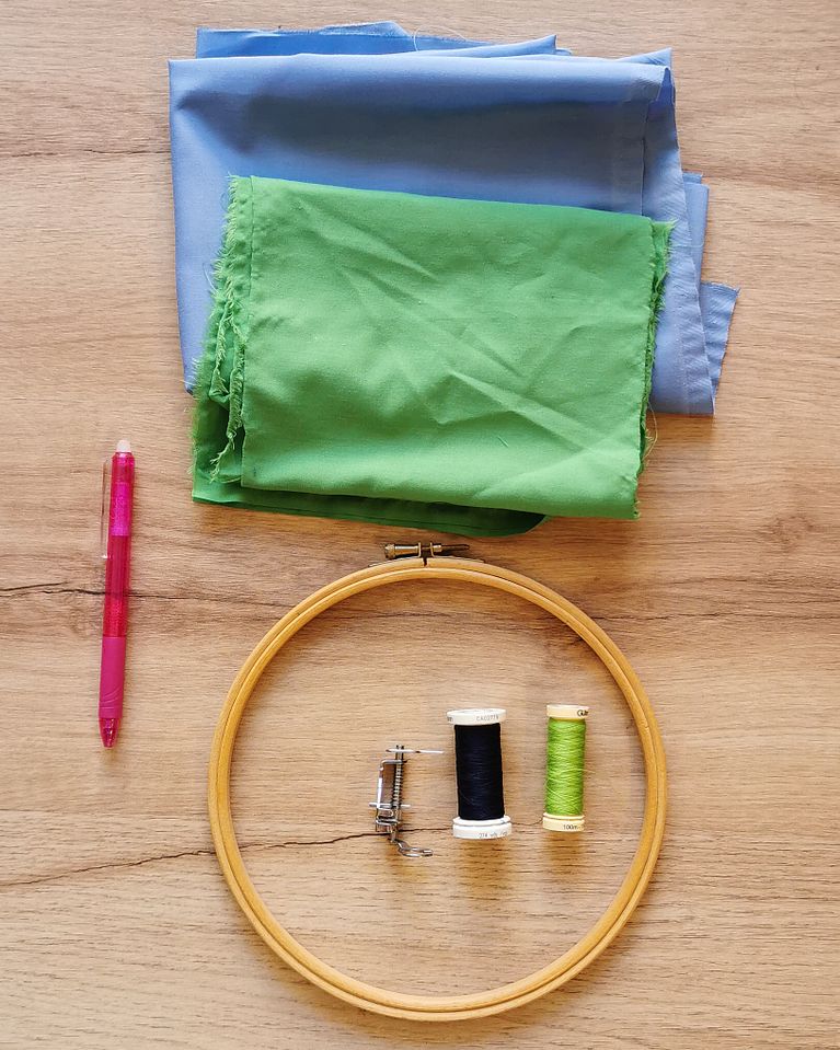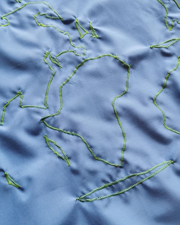Prepara tu máquina de coser para bordar y tensando la tela con un bastidor, empieza a bordar líneas azules en la zona del "agua" como si fueran las corrientes.