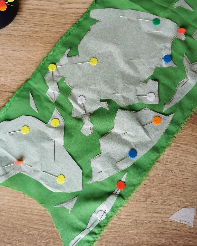 ¡Con muchos alfileres! Ponlas formas de papel sobre la tela verde, recortarlas y por último, colocalas en posición sobre el pañuelo, asegurando que estén bien fijadas.