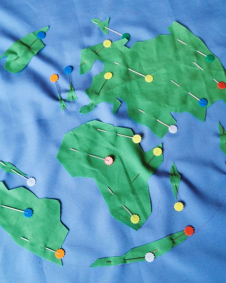 Con un hilo azul, repasa el perímetro del mundo para delimitarlo.
