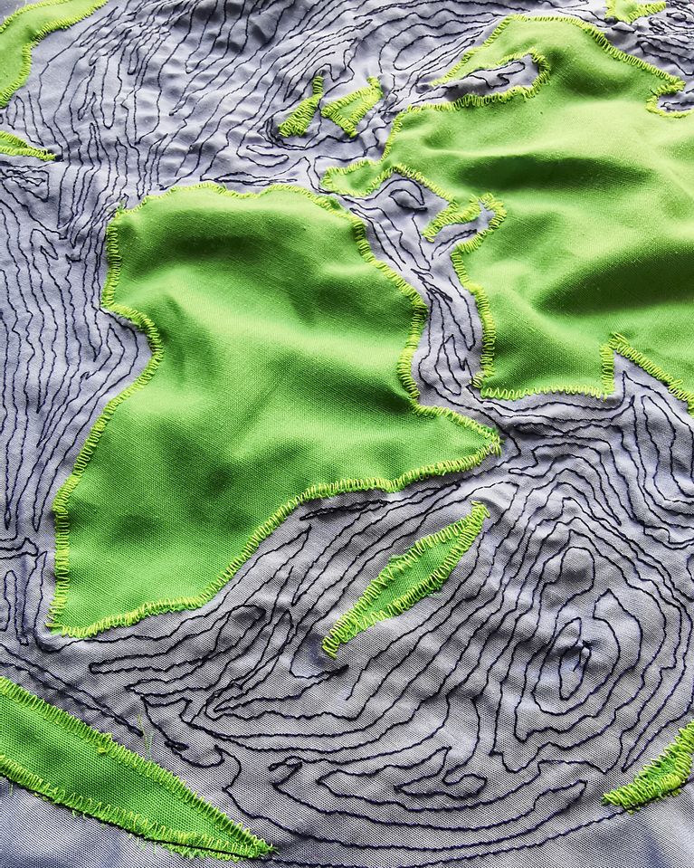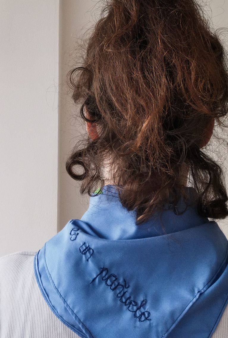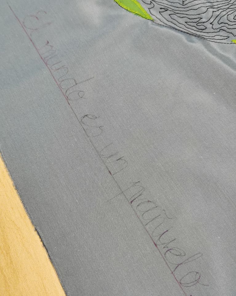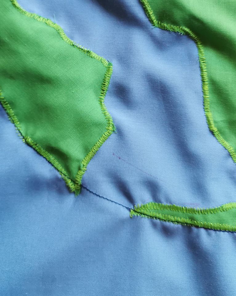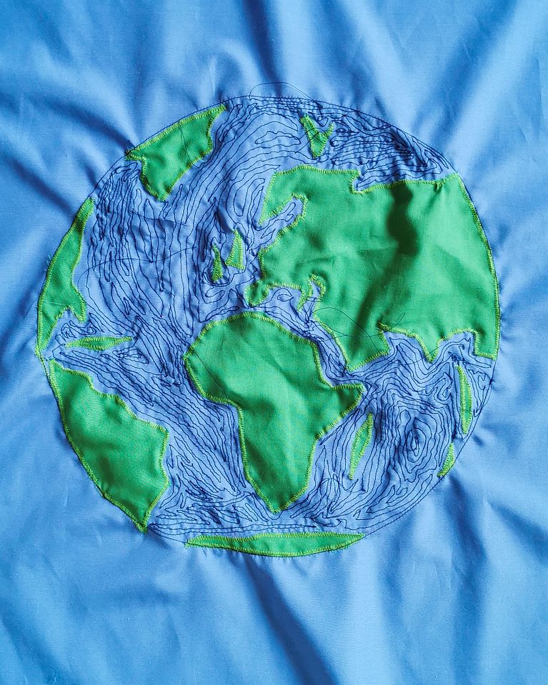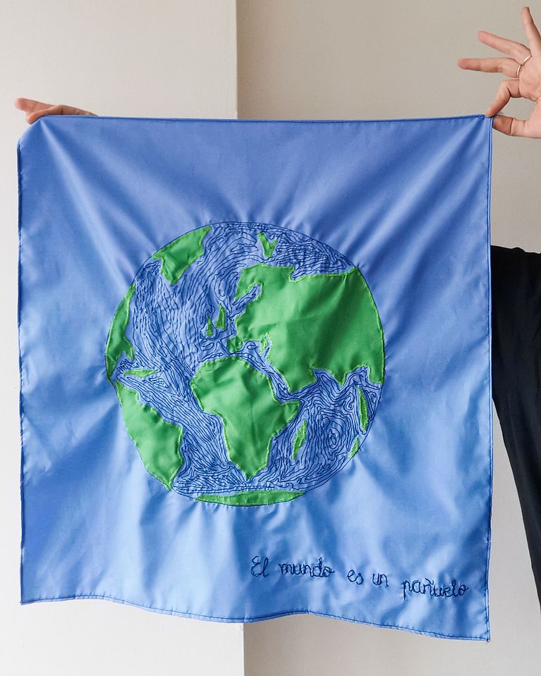 Usando la técnica del aplique y del bordado a máquina, plasmé la imagen del planeta Tierra en un pañuelo, convirtiéndolo así, literalmente, en un pañuelo.