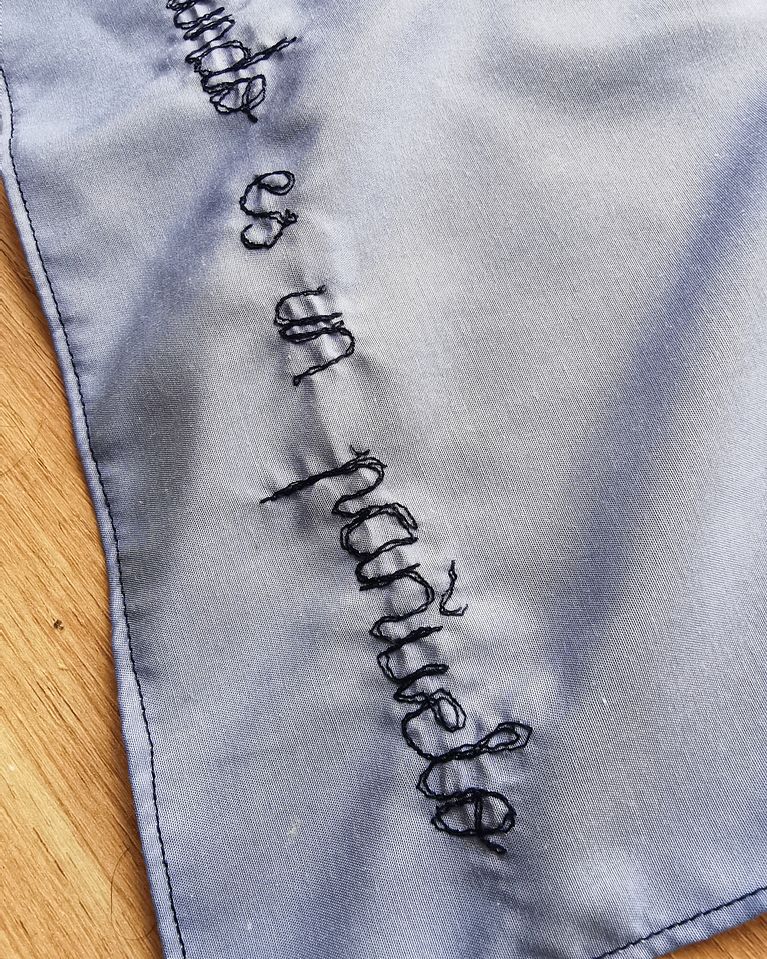 Con un rotulador de tela, escribir la frase y al igual que antes, bordar dando un par de pasadas.