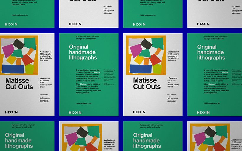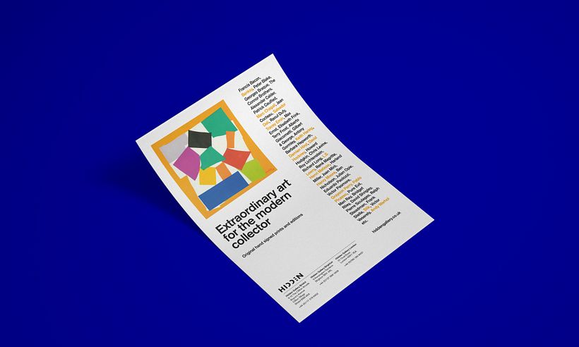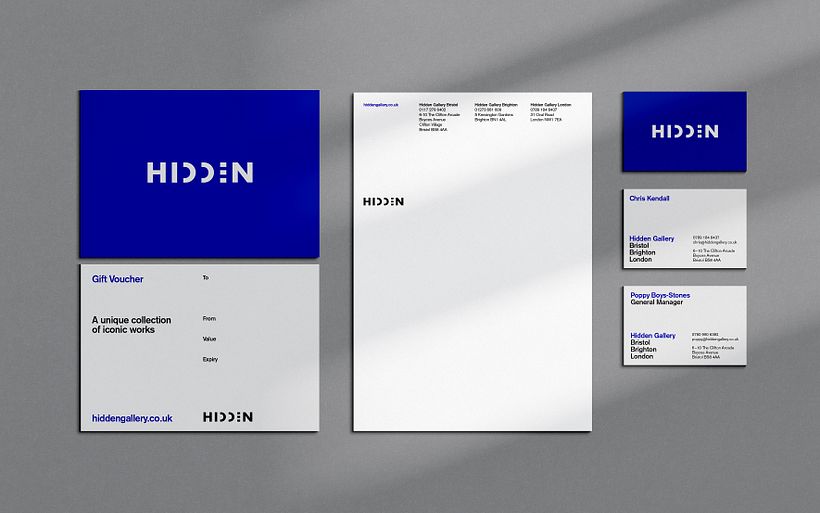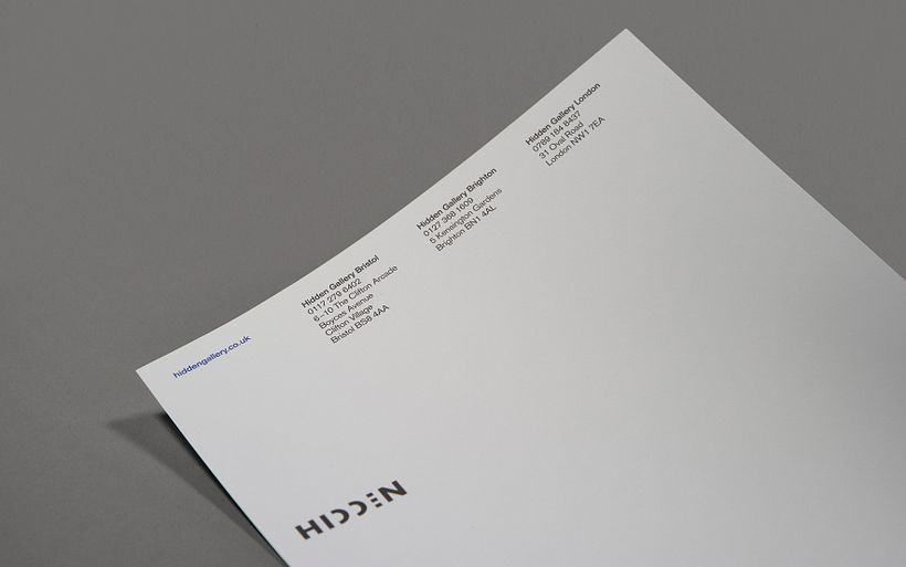 At the beginning of the design process, I visited Hidden galleries in Brighton and Bristol, meeting some of their highly approachable team. They are all so enthusiastic about art and have a real passion for what they are doing. The whole process was enjoyable and collaborative. By working together with their team, I was best able to understand how I could use design to help them with their daily tasks, as well as keeping the identity consistent across multiple and varied outputs (leaflets, social media posts, publication, stationery, gift voucher, tissue paper, stickers etc.).