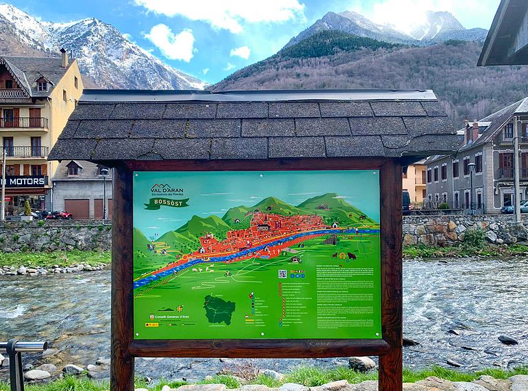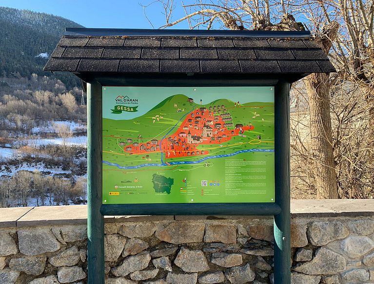 Cada pueblo se representa en su entorno natural de las montañas de los Pirineos, incluyendo las cumbres más altas de la zona.