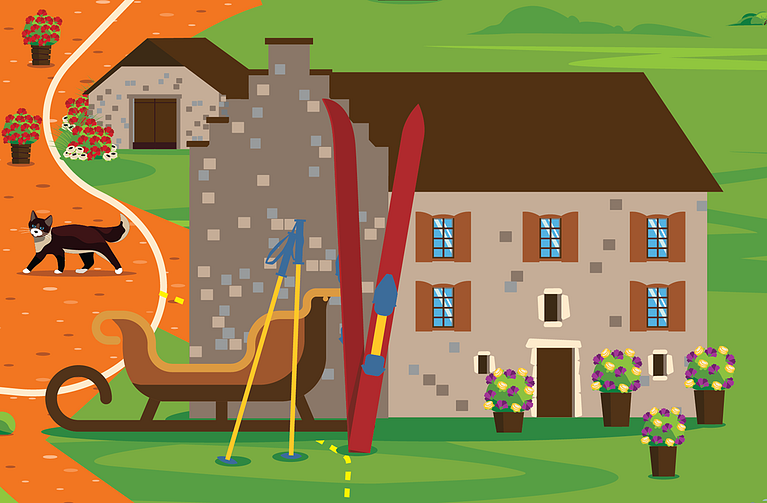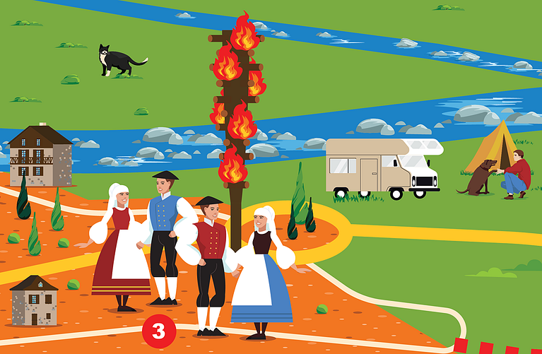 Each village is represented in its natural environment, the Pyrenees mountains, including the area's highest peaks.