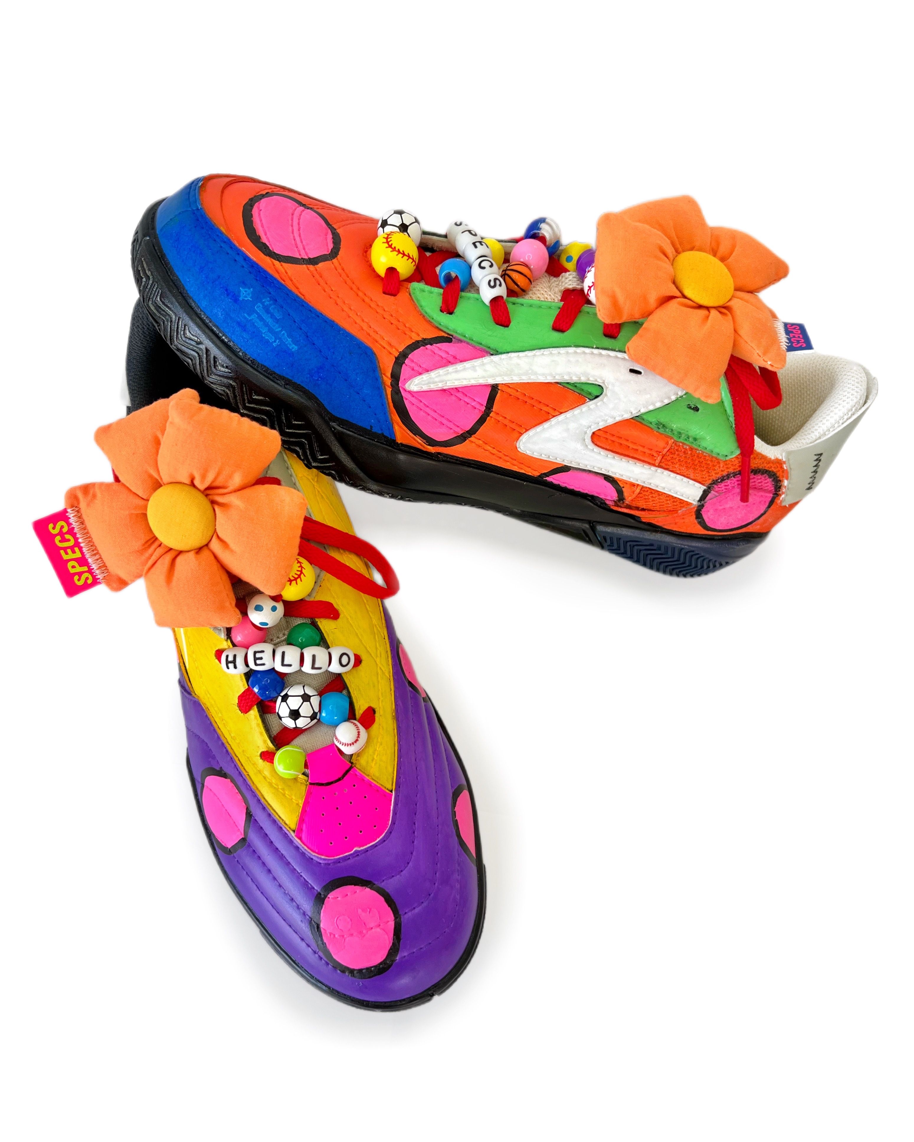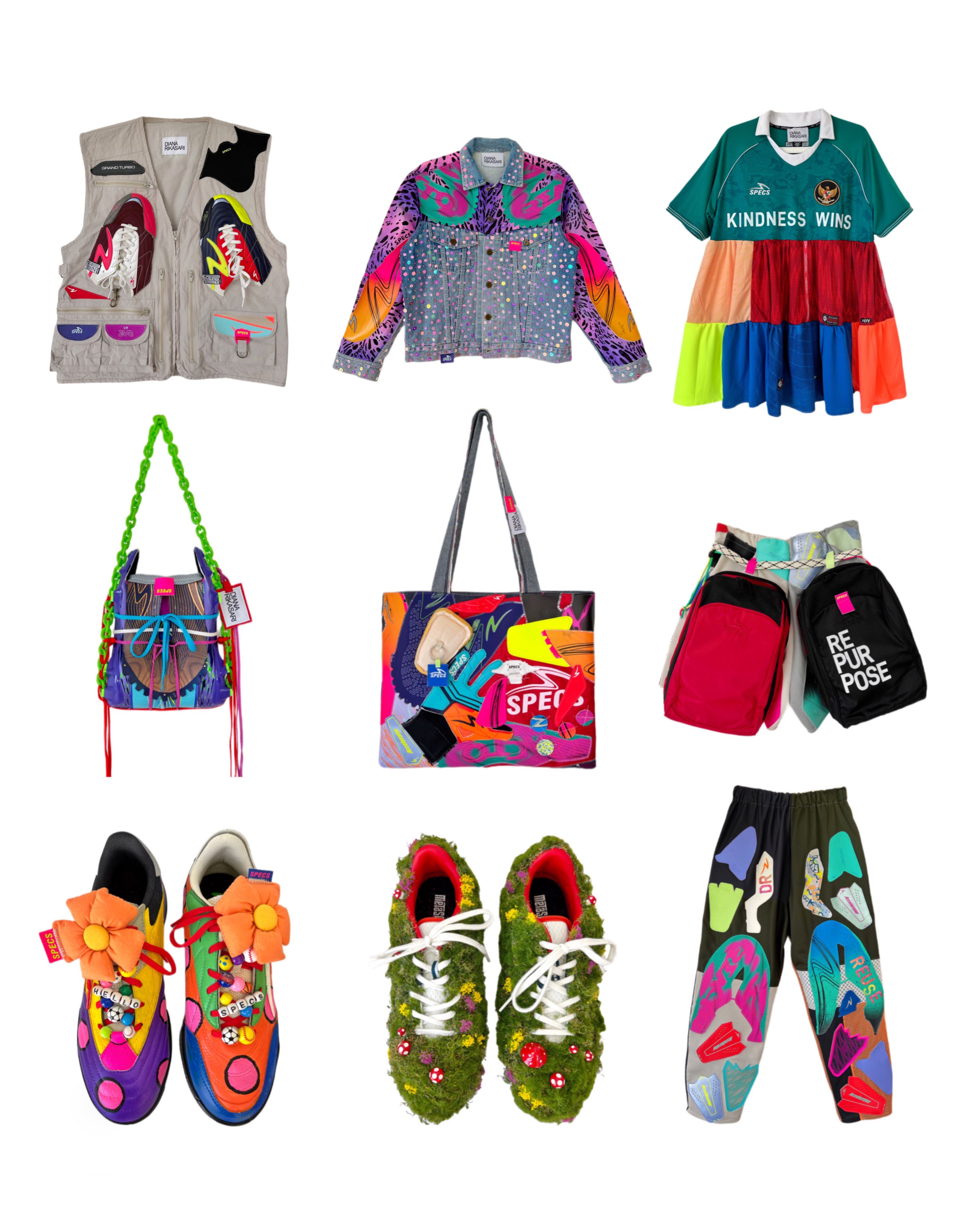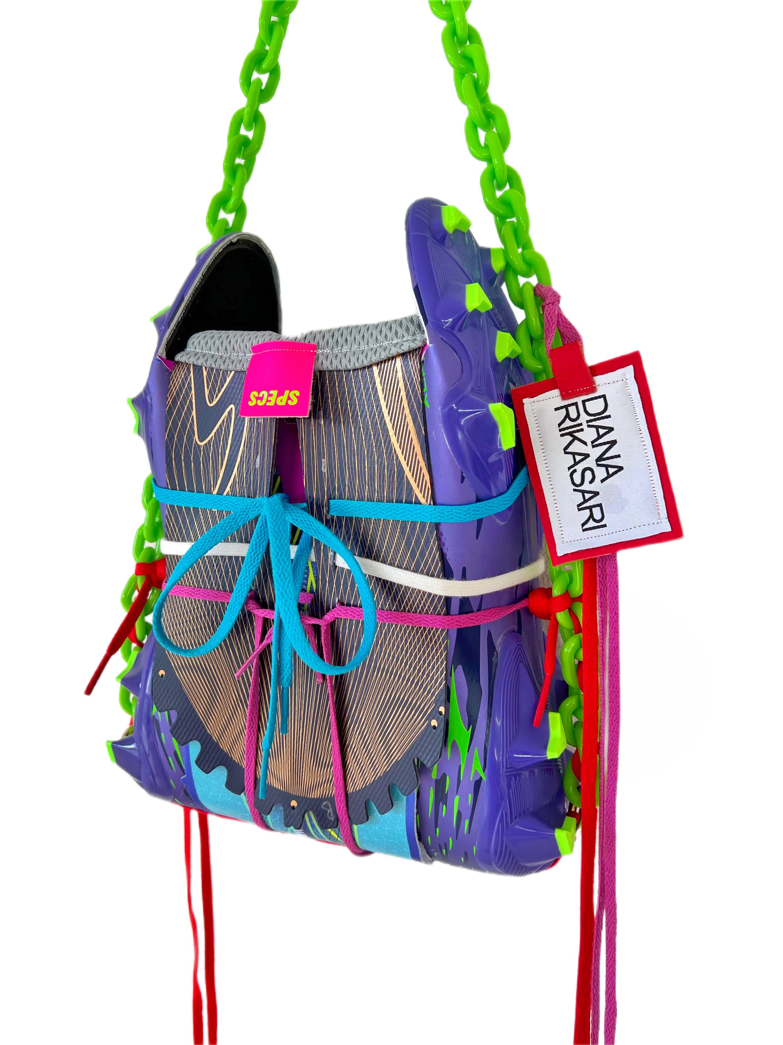 Rather than allowing deadstock to sit in storage or be discarded, Diana took Specs' unused football gear and reimagined it through her signature lens: bold, quirky, and sustainable. Working with old stock that included retired jerseys from past collections, unused kits with misprints or outdated designs, stockpiled accessories like gloves and shoelaces, Diana deconstructed and reconstructed each item by hand, combining materials in unexpected ways to create avant-garde streetwear pieces, accessories, and even sculptural fashion art.