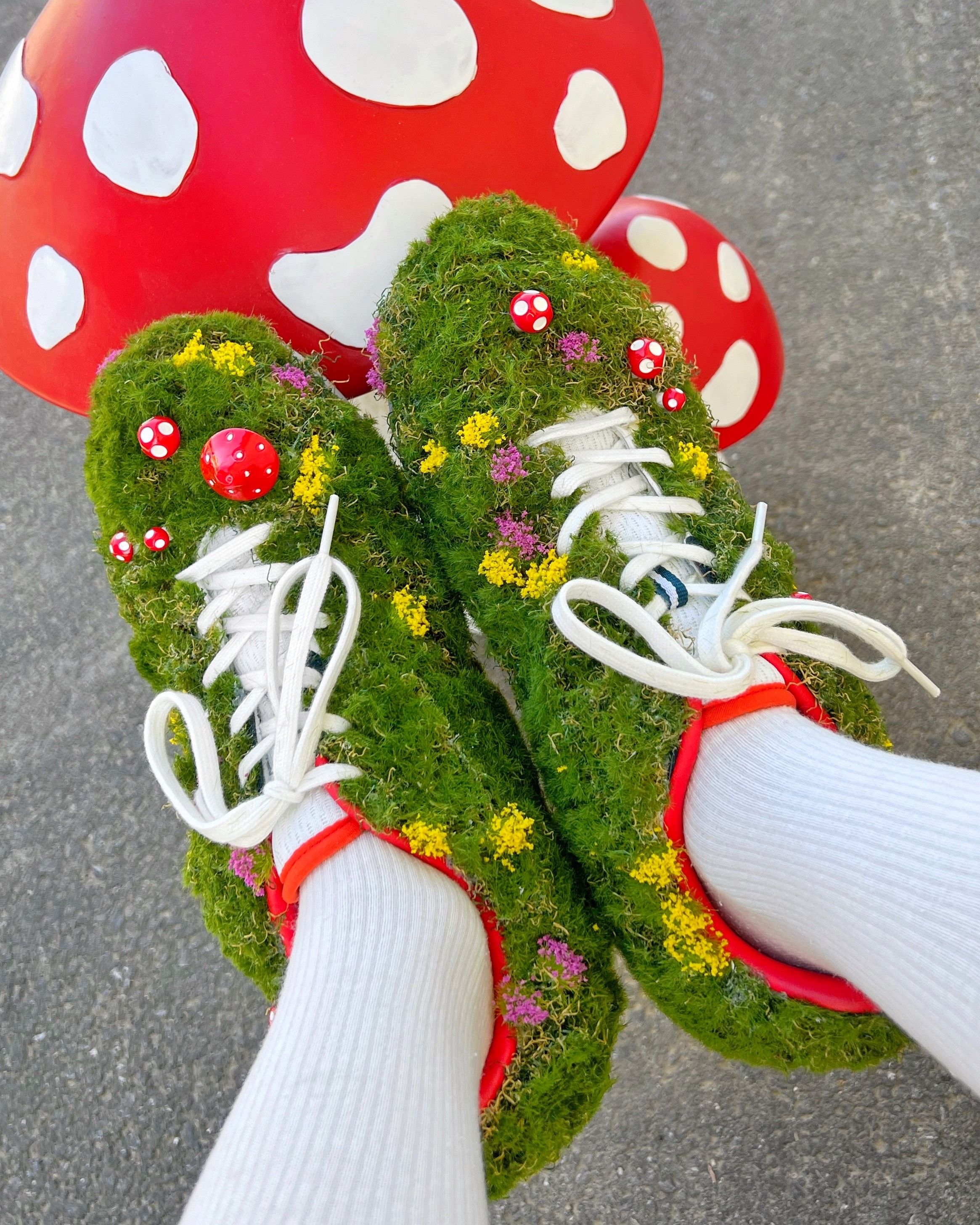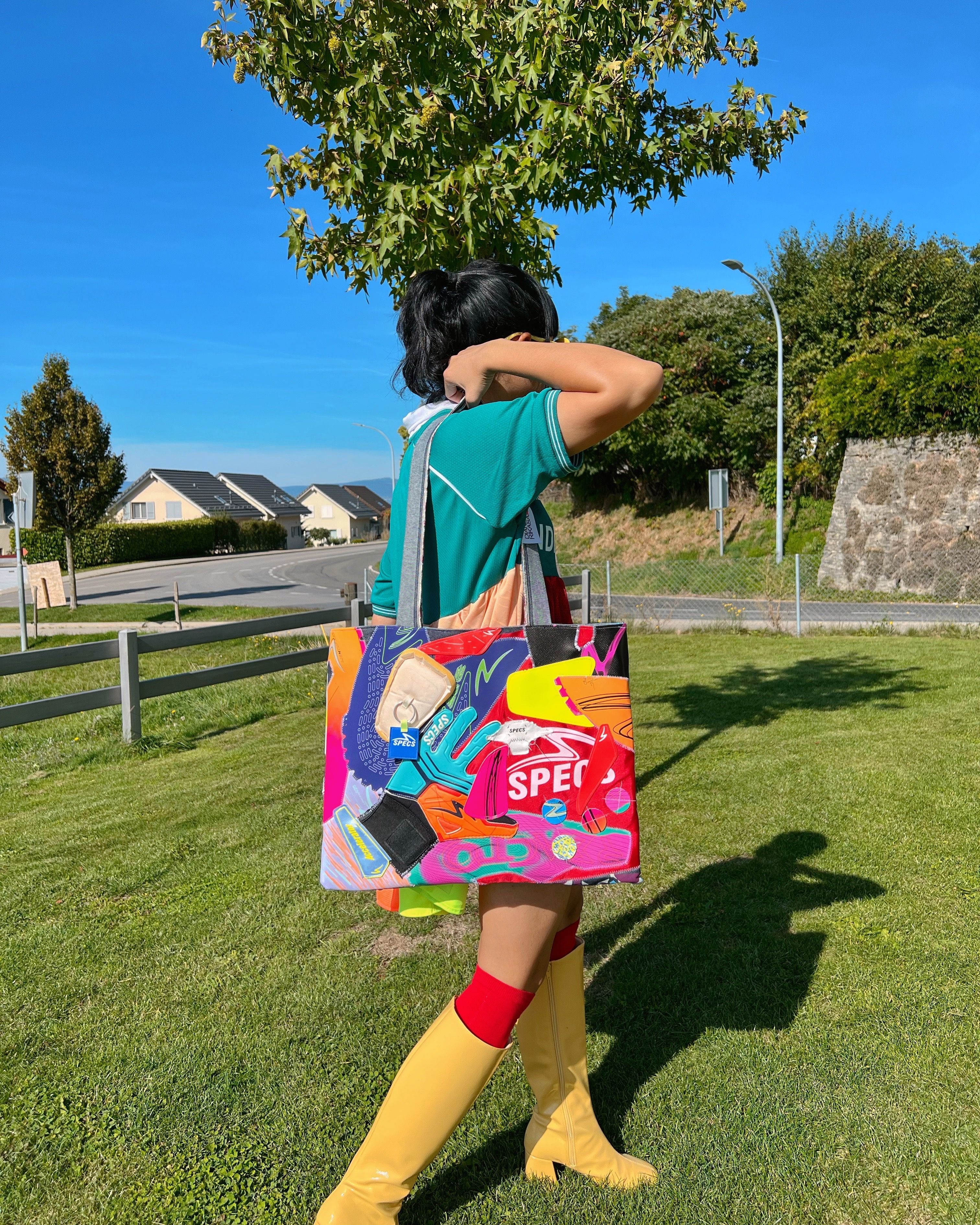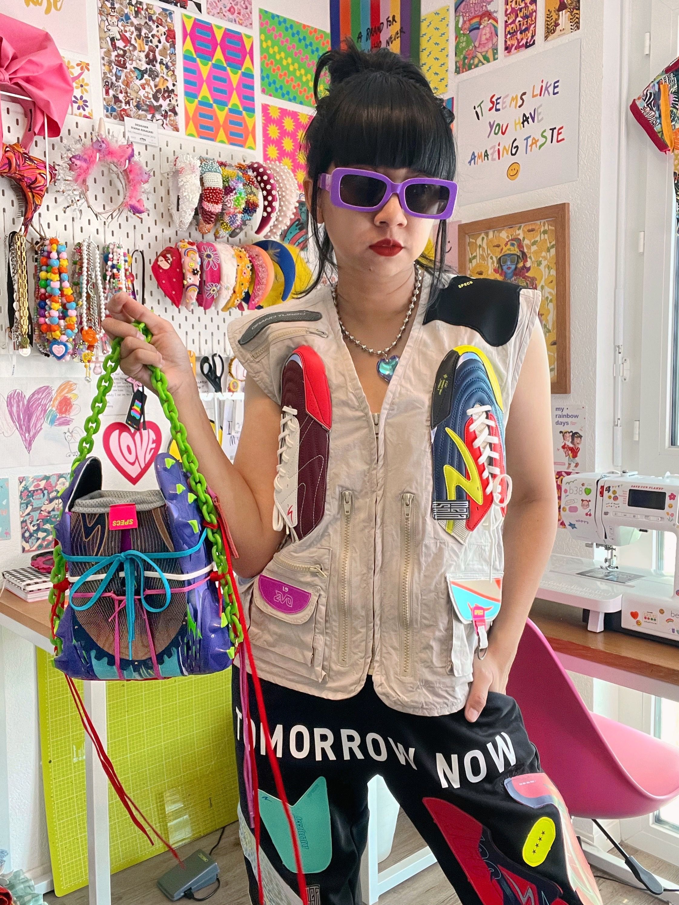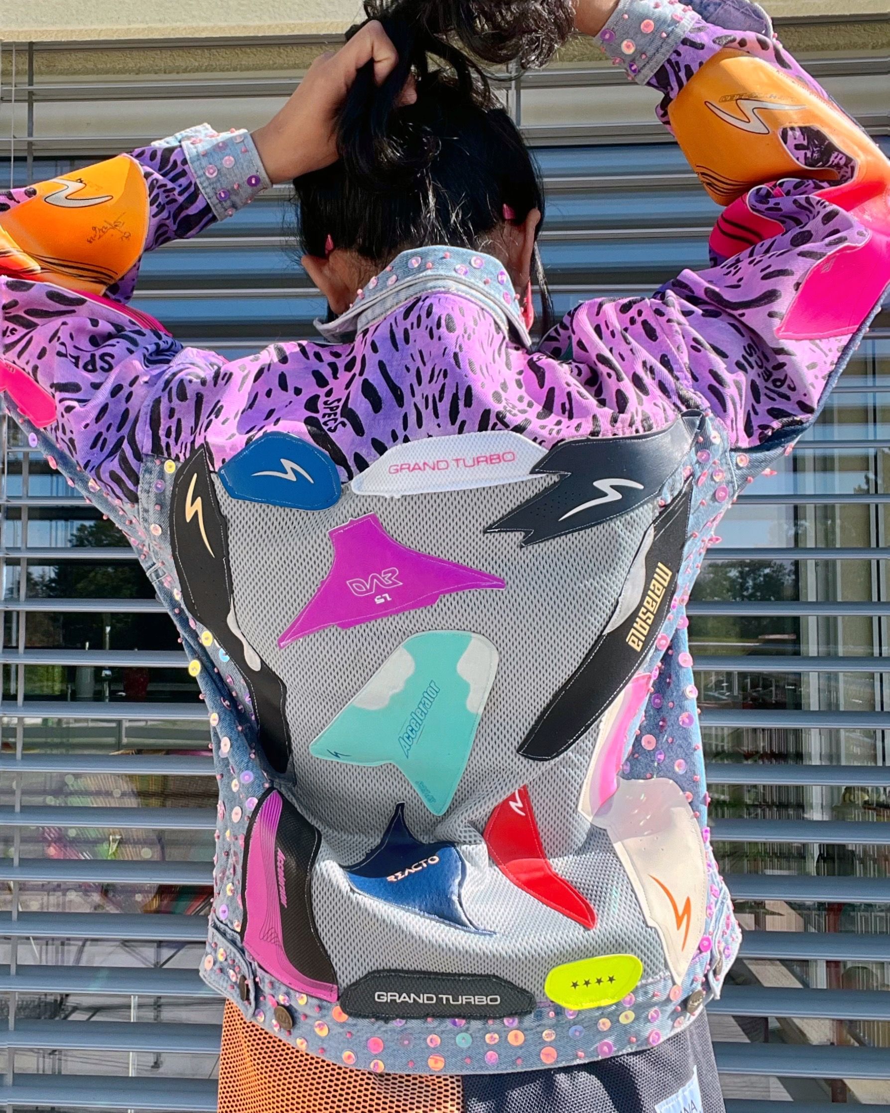 En lugar de dejar que los artículos descatalogados se quedaran almacenados o se desecharan, Diana reinterpretó el equipo de fútbol sin usar de Specs con su estilo característico: atrevido, original y sostenible. Trabajando con artículos antiguos, como camisetas retiradas de colecciones anteriores, equipaciones sin usar con errores de impresión o diseños anticuados, y accesorios acumulados como guantes y cordones, Diana deconstruyó y reconstruyó cada artículo a mano, combinando materiales de formas inesperadas para crear prendas urbanas vanguardistas, accesorios e incluso arte de moda escultural.