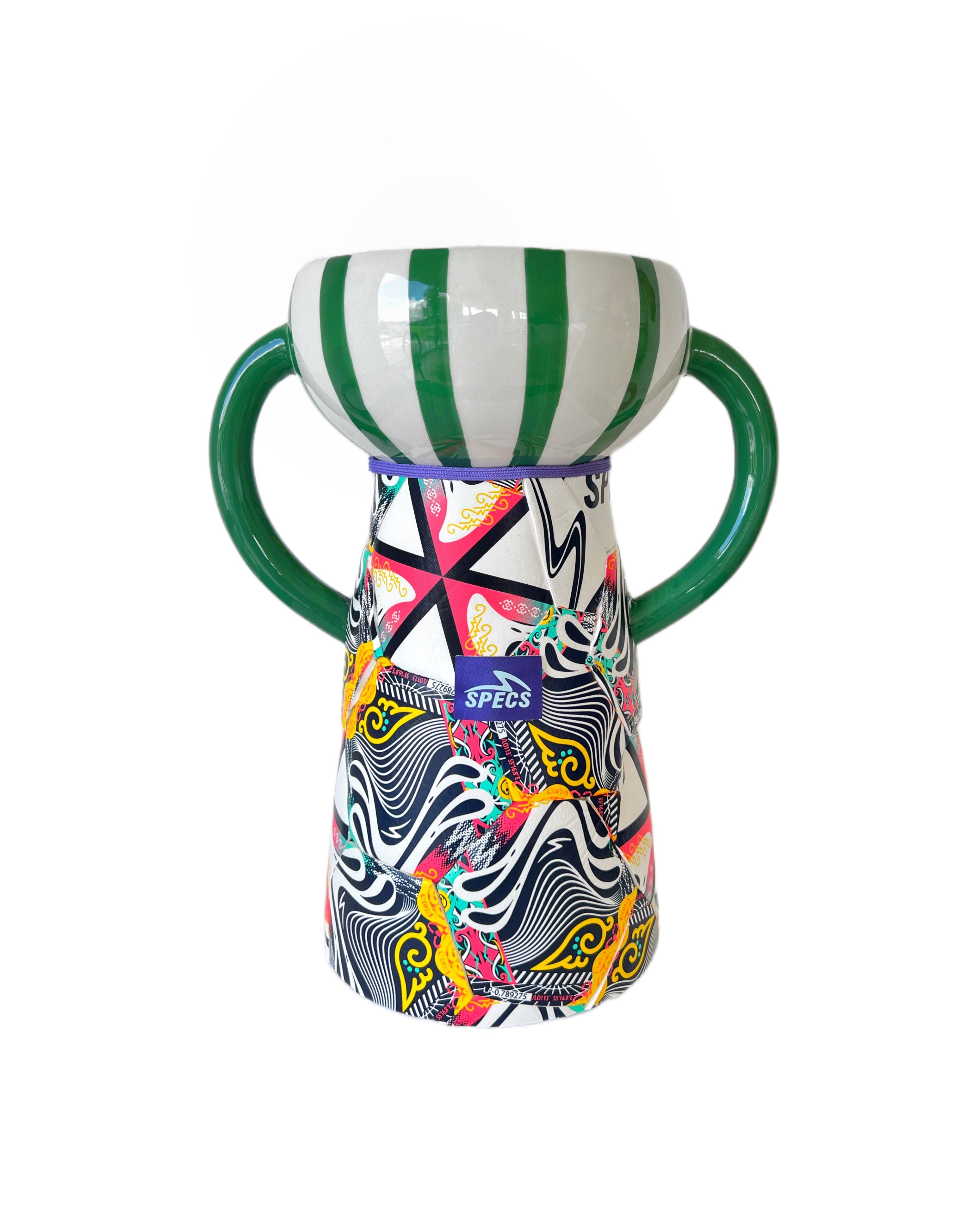 En una colaboración audaz e inesperada, Diana Rikasari se asoció con Specs Indonesia, una marca líder de ropa deportiva indonesia, para revitalizar un inventario olvidado. El proyecto consistió en reciclar material de fútbol de desecho, como camisetas, uniformes de entrenamiento, zapatillas y accesorios deportivos sin usar, para crear piezas vibrantes y vanguardistas que redefinieron el futuro de los residuos deportivos.