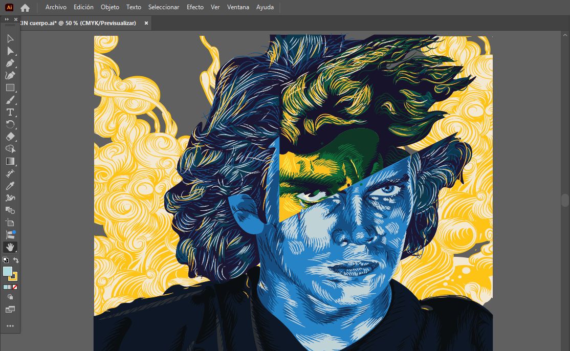 En esta etapa comencé a vectorizar, capa por capa, el rostro de Anakin, cuidando cada detalle para transmitir con precisión la intensidad de su expresión. Mi objetivo fue retratar esa mirada cargada de rencor que comparten tanto Anakin como el ángel caído, reforzando así el paralelismo entre ambos personajes y la fuerza emocional que los une.