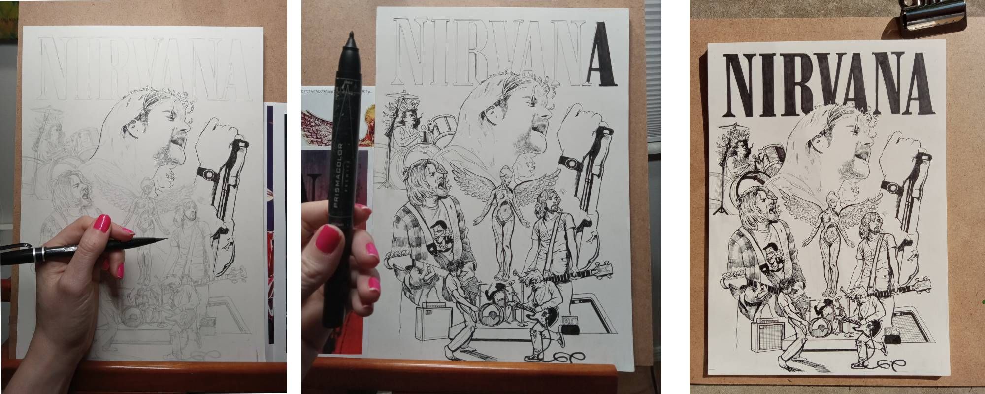 Una vez satisfecho con la representación a lápiz, procedí al entintado. Para las tintas, usé principalmente un rotulador Pentel Micro Black Brush, y para los detalles más pequeños, Microns. Para sombrear las zonas de sombra, utilicé técnicas de rayado y rayado cruzado. Para el texto de Nirvana, usé el marcador Prismacolor Black para rellenar el centro y una regla de 15 cm para que el texto fuera más preciso.