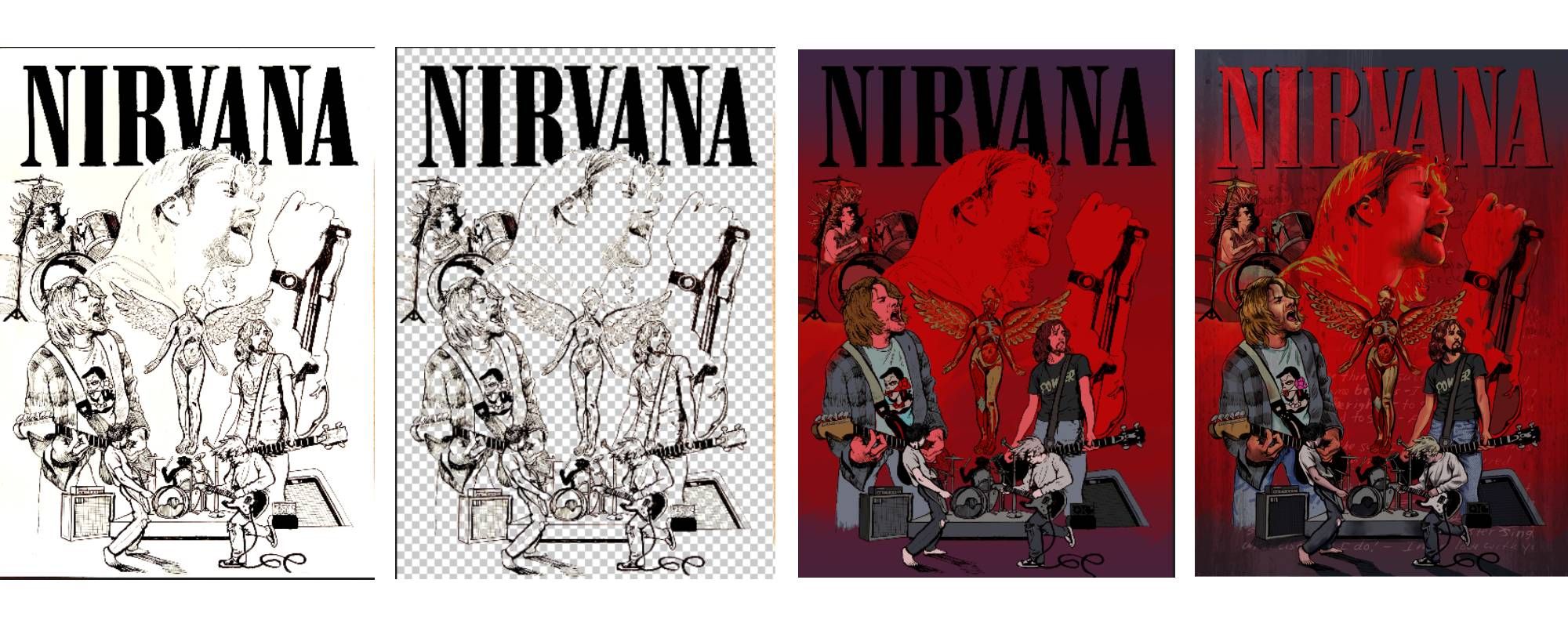 Luego, tomando muestras de los colores de mi maqueta inicial, comencé a aplicar los colores locales tanto a los personajes como al fondo. El texto de Nirvana se cubrió con una capa para que el negro fuera más uniforme y mate.