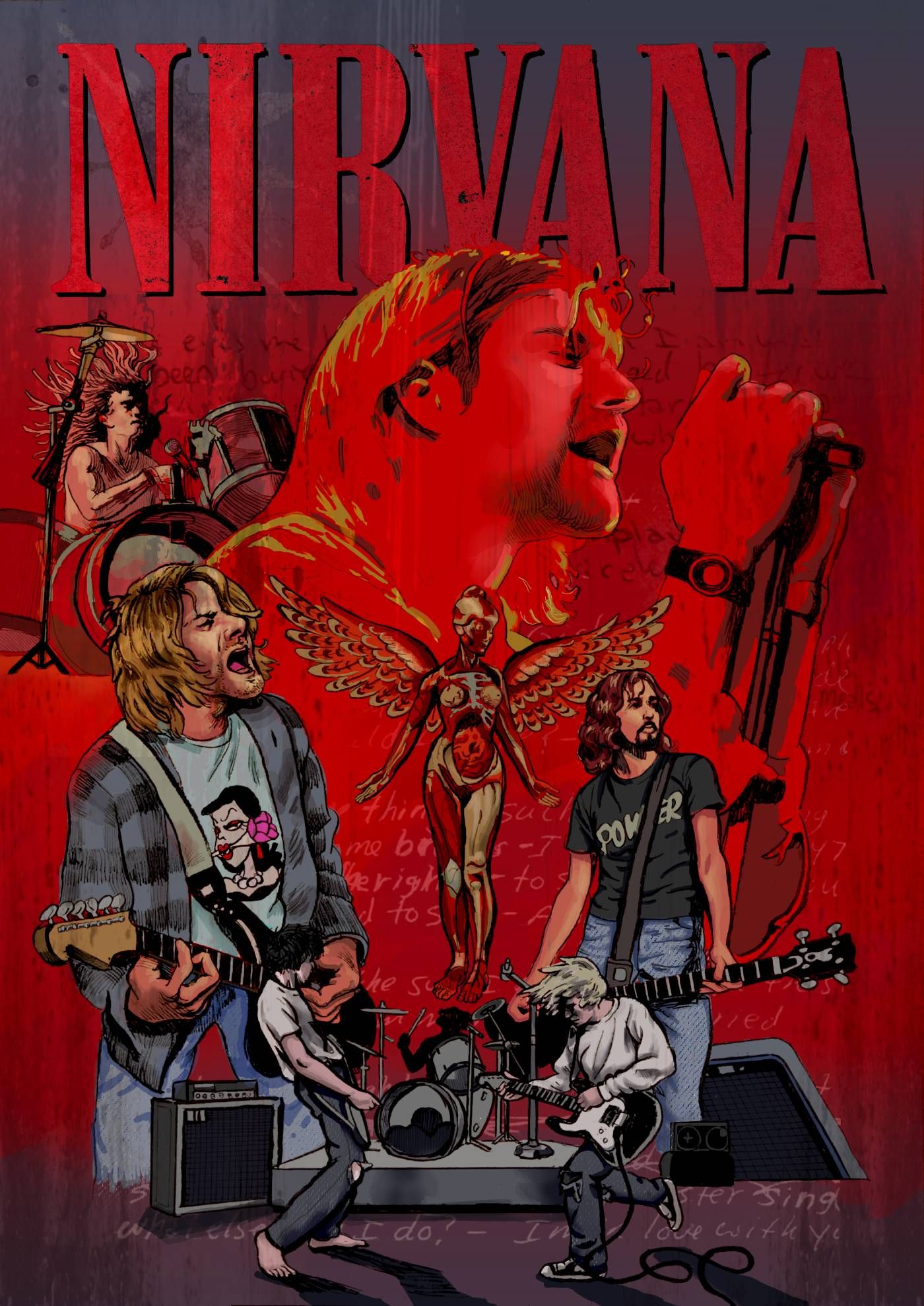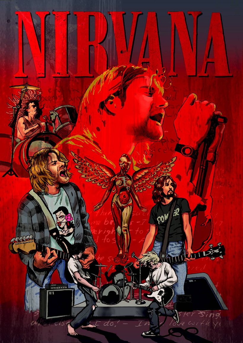 Como toque final y homenaje, incluí dos letras de canciones escritas a mano por Kurt Cobain de In Utero en el fondo del cartel: "All Apologies" y "Heart-Shaped Box".