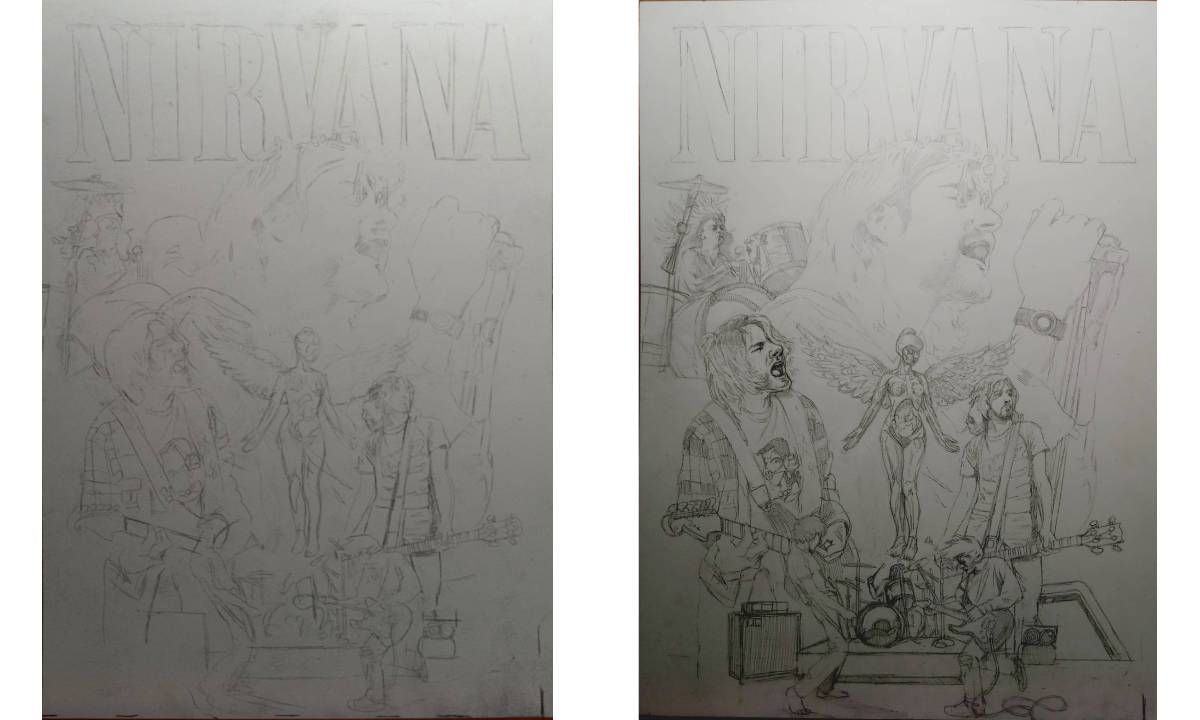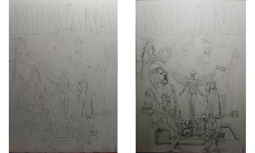 Mi visión para el proyecto era crear un tributo a Nirvana al estilo de los carteles ilustrados de cine, similar a artistas como Drew Struzan y Richard Amsel. El artista Art Nouveau Alphonse Mucha también fue una fuente de inspiración, especialmente por sus pinturas épicas eslavas. El plan inicial era realizar todo el proceso de forma tradicional, comenzando con bocetos a lápiz, entintado, acrílico y una capa final de lápices de colores. Muchas de las técnicas las aprendí en el curso Domestika de Robert Sammelin para Diseño de Portadas.