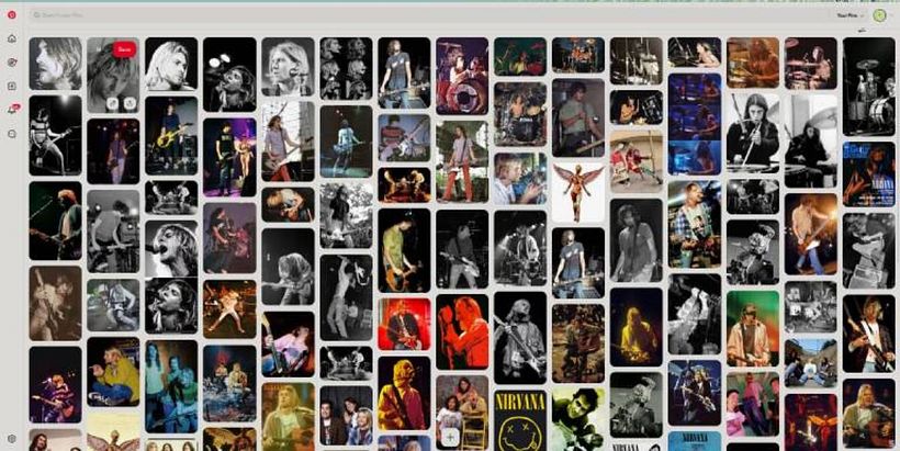 Para empezar, recopilé numerosas imágenes de referencia, tanto de la búsqueda de imágenes de Google como de un tablero de Pinterest de Nirvana, con fotos de referencia de los miembros de la banda, diseños de pósteres y el icónico ángel anatómico de In Utero. Esto me ayudó a definir la atmósfera, la paleta de colores y las posibles poses de cada miembro del grupo. Con el programa Photopea (similar a Photoshop), administré imágenes de referencia, texturas, texto y efectos adicionales para experimentar con posibles arreglos para el póster, hasta obtener una maqueta preliminar de la pieza final.