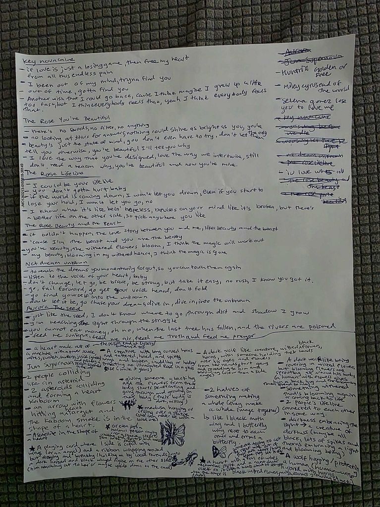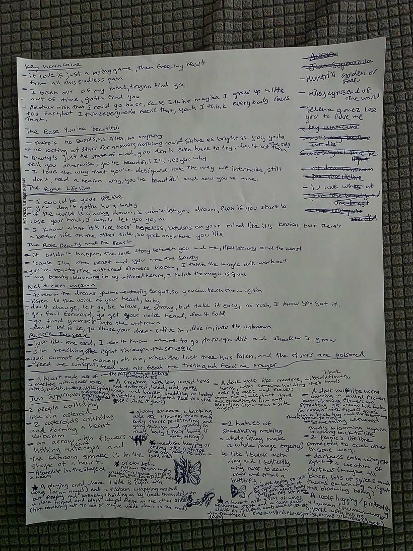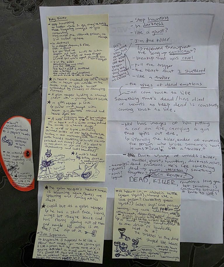 Al final elegí la canción "Killer" de Key y comencé a escribir y subrayar las partes que me parecían significativas y que podían simbolizar algo más profundo. Fue una forma de analizar la canción en detalle, descomponiéndola en palabras e imágenes. Lo que noté es que se repetían palabras más oscuras: "asesino, suspenso, fantasma, inquietante, oscuridad, cenizas, emociones muertas, cruel, destrozado" (y la lista continúa). Usando notas adhesivas como una especie de mapa mental, rápidamente se me ocurrieron ideas e imágenes que podrían representar el desglose de la letra.