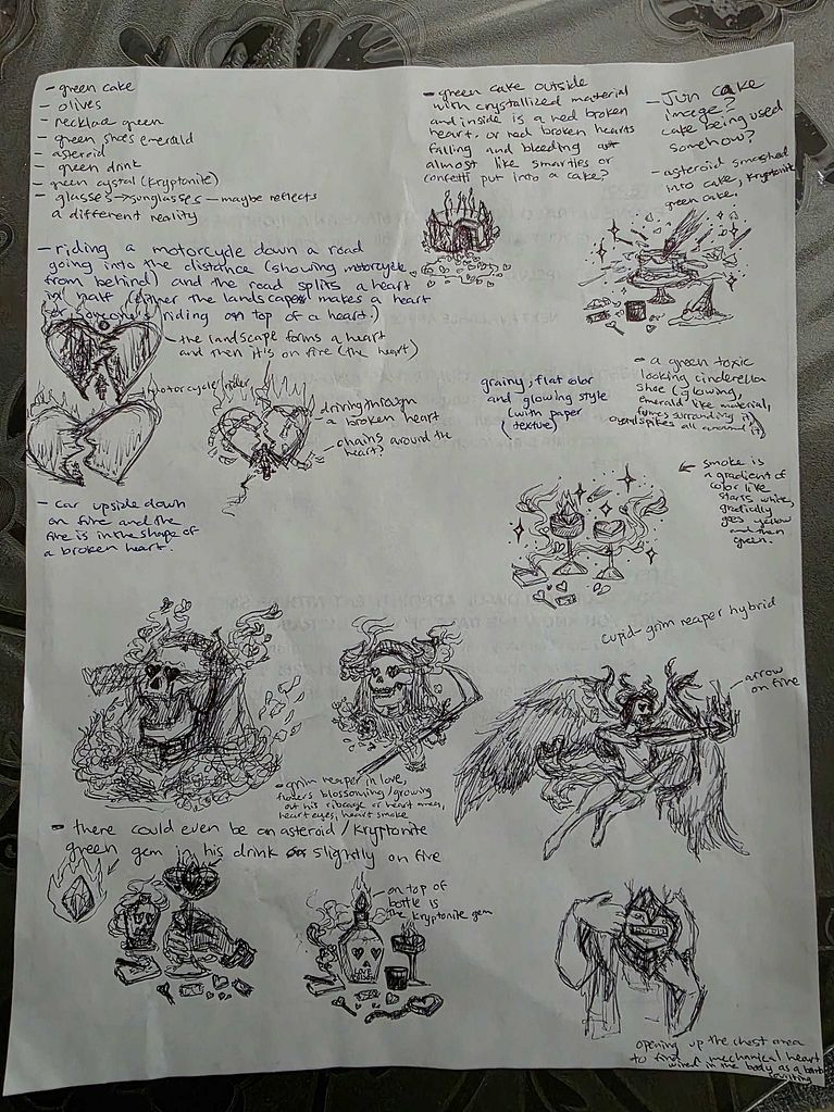 Hice bocetos preliminares de un par de ideas diferentes y terminé decidiéndome por una parca enamorada. Para mí, las palabras casi parecían indicar que era alguien oscuro, muerto, y que ya no tenía emociones por ser un asesino, pero por muy cruel que fuera, alguien intentaba revivirlo a él y a todas las emociones muertas (las "cenizas").