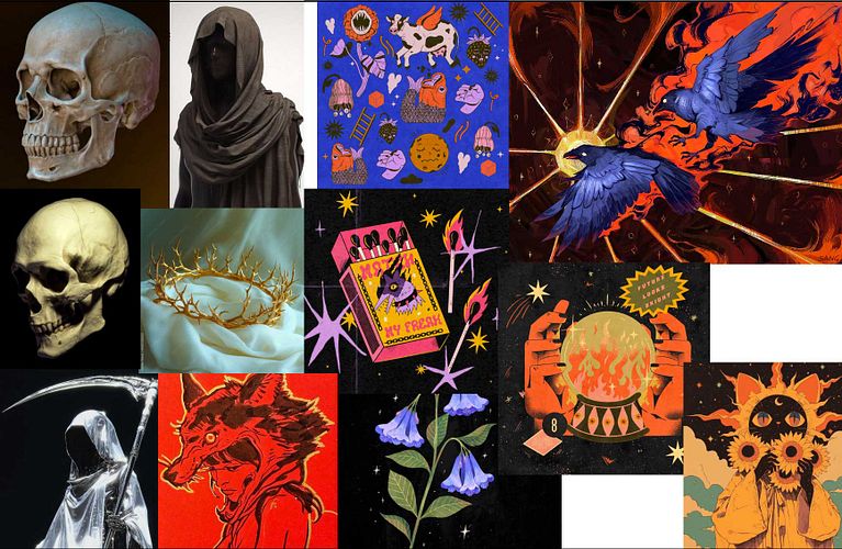 A continuación, hice un moodboard con algunos colores que me gustaría usar, un posible estilo, junto con algunas referencias para ayudarme a esbozar una versión más refinada de mi idea.