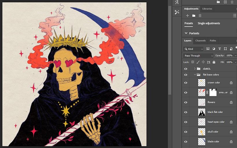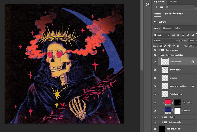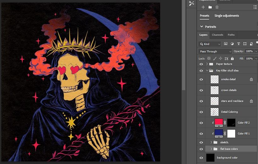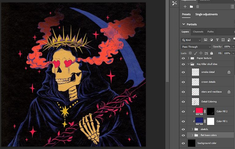 El estilo y el concepto musical de Key cambian con cada lanzamiento de álbum, y participa activamente en la narrativa de sus videos musicales, lo cual me resulta realmente inspirador. Cada concepto es muy diferente del anterior, y el estilo, la historia, los colores y la letra te hacen reflexionar. Quería centrarme en su canción "Killer" porque pensé que su letra simbolizaba algo más profundo. Dice repetidamente que es un asesino, lo que implica que tuvo un papel importante en una ruptura dolorosa, donde terminó la relación causándole angustia, daño emocional, culpa y, ahora, sentimientos persistentes por esa persona. Aunque no es un asesino físico, su uso siniestro de palabras (por ejemplo, en la oscuridad, como un fantasma, soy el asesino, aprieta el gatillo, el corazón que destrocé, como un thriller, las cenizas de las emociones muertas vuelven a la vida) lo hace parecer cruel, un asesino que intenta mantener muertas las cenizas de las emociones muertas, pero se atormenta porque estas siguen [coming]a la vida. Como resultado, pensé que una parca encarnaba el mensaje de muerte, tormento y emociones persistentes que parecían imposibles de revivir. Me inspiré para darle un toque retro a la ilustración, ya que el estilo y los colores de la canción tenían mucha influencia retro.