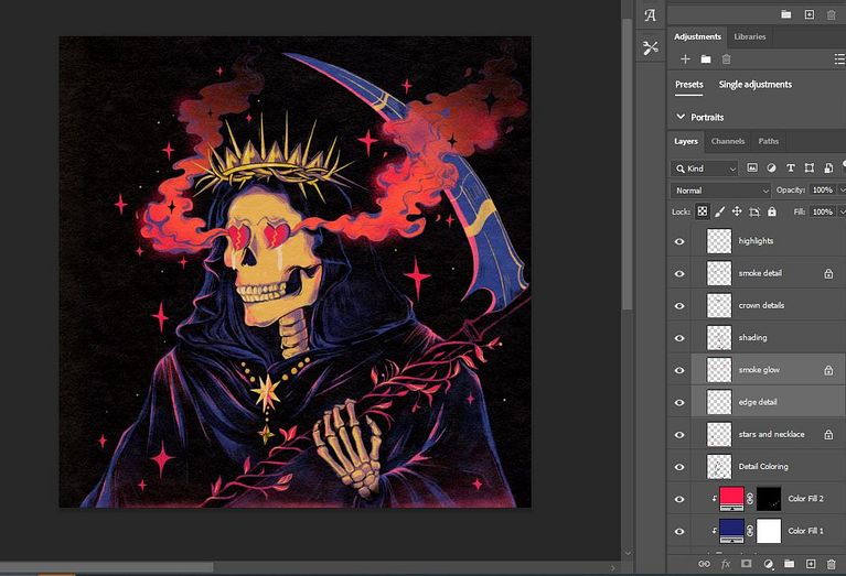 Luego agregué algo de sombreado al rostro y la mano, y más rosa y azul a la ropa para darle más dimensión. Como la mayor parte del dibujo es en negro, usé morados y azules más oscuros para resaltar las sombras.