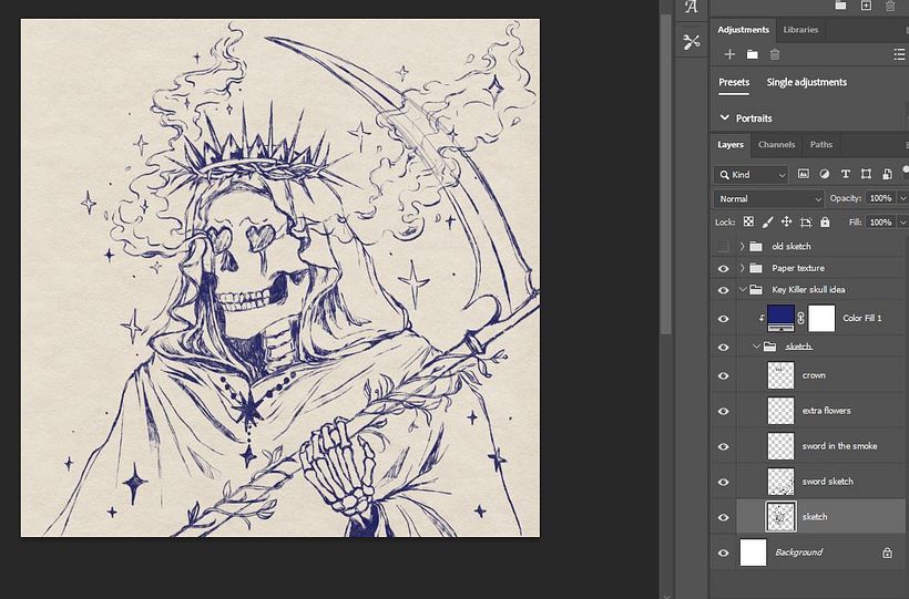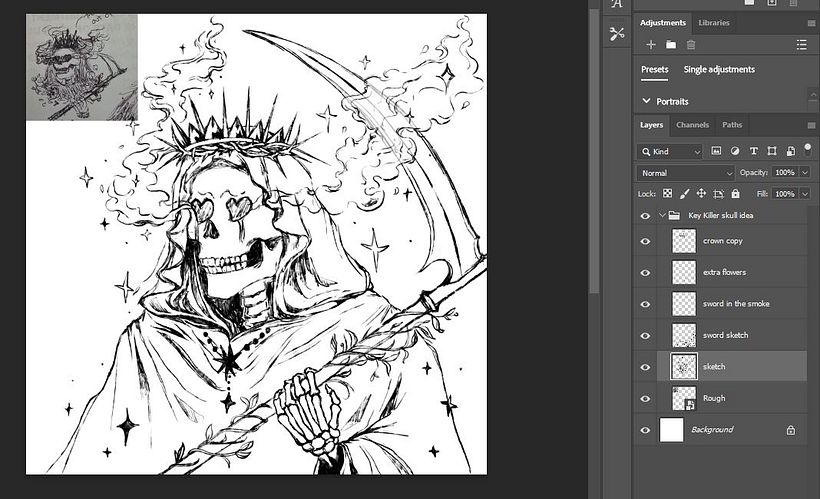 Llevé mi boceto preliminar a Photoshop para usarlo como guía para mi idea y comencé a dibujar.