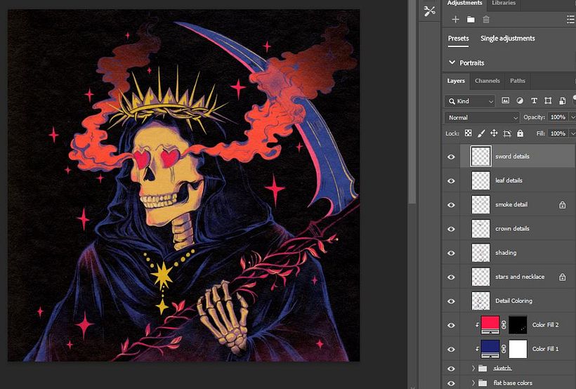 After doing some initial highlights on the sword, I made some additional layers and painted in even more highlights on the face, pink highlights into the fabric folds of the clothing, more shine in the blade, and added some smaller stars. By adding highlights, you get more depth by indicating where the light and shadows are and it helps make the image pop out against the dark background.