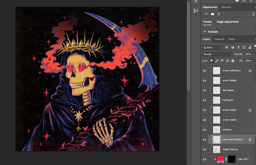 Tras aplicar algunas luces iniciales a la espada, creé capas adicionales y pinté aún más luces en la cara, luces rosas en los pliegues de la tela, más brillo en la hoja y añadí estrellas más pequeñas. Al añadir luces, se consigue más profundidad al indicar dónde están las luces y las sombras, y ayuda a que la imagen destaque sobre el fondo oscuro.