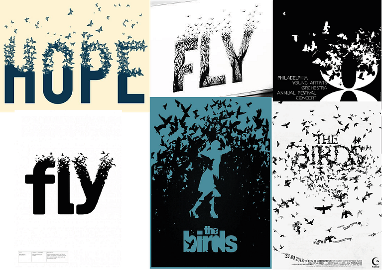 Desde el inicio tenía clara la idea de querer representar mi nombre formado por golondrinas volando. Para tener una referencia visual y encaminar mi proyecto, busqué proyectos similares de tipografías formadas por animales y realicé un moodboard.