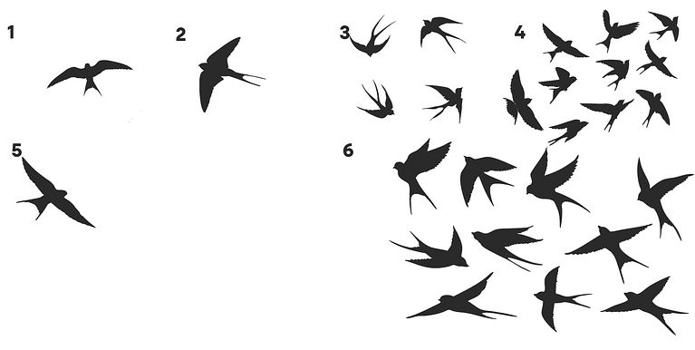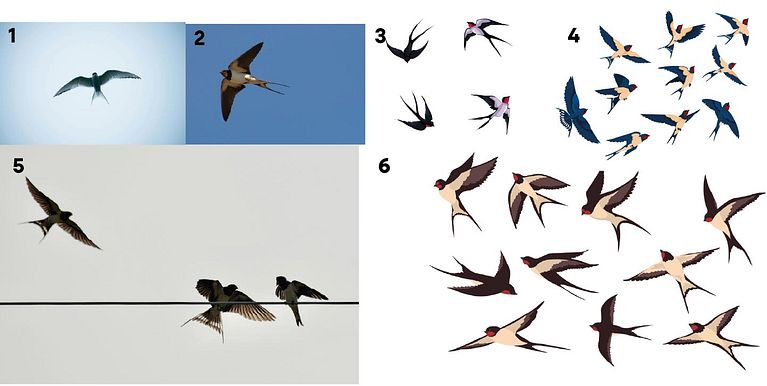 El siguiente paso, fue buscar en bancos de imágenes fotografías e ilustraciones de golondrinas, para luego editarlas de forma que quedase solo la silueta en negro de estos pájaros. Créditos: