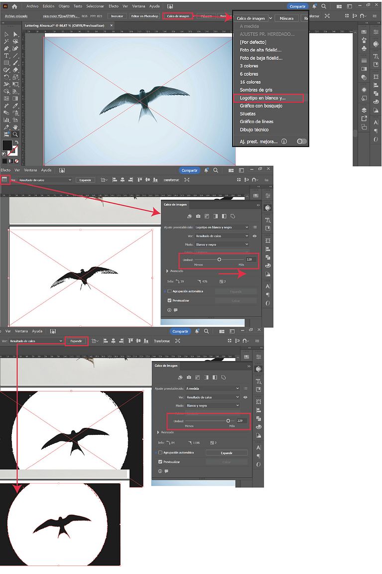Para obtener la silueta, el proceso fue sencillo: utilicé la función de "Calco de imagen", seleccioné la opción "Logotipo en blanco y negro" y, desde el panel de calco, aumenté el umbral hasta conseguir una silueta completamente negra. A continuación, apliqué la opción "Expandir" para obtener los contornos de las formas y eliminar posteriormente las partes que no resultaban necesarias.