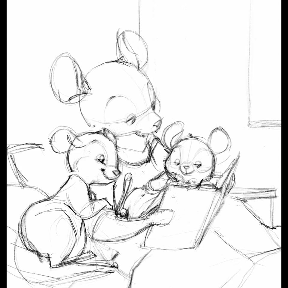 Dans la petite vidéo, on peut voir mes hésitations et autres tâtonnements avant d'atteindre la composition finale. Le crayonné a simplement été retourné au moment de passer à la peinture, pour permettre de mieux voir la première de couverture du livre.