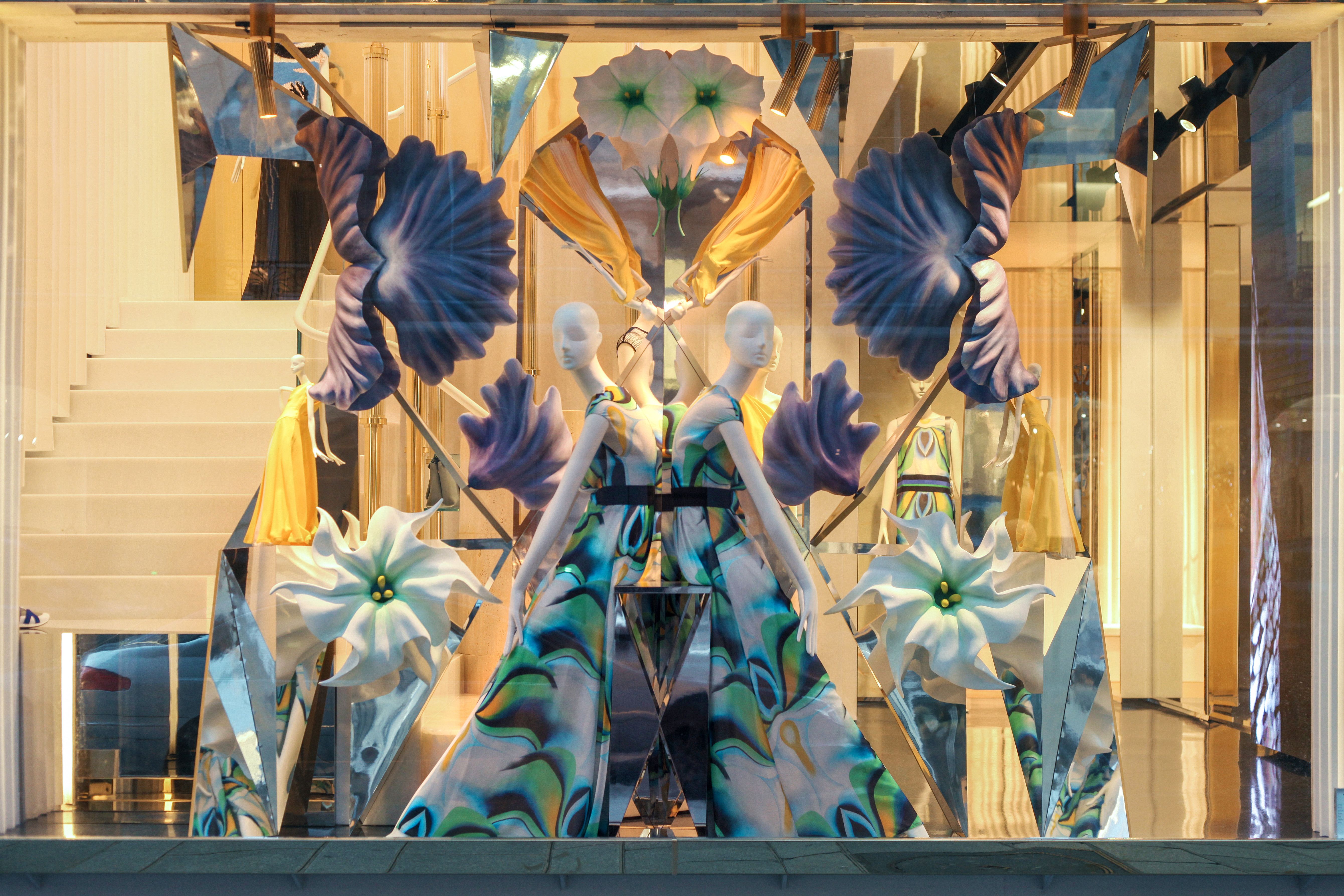 Quella che è solo un'illusione ottica nel caleidoscopio, diventa, nella vetrina, una realtà tridimensionale attraverso il mix di sculture e specchi su misura.