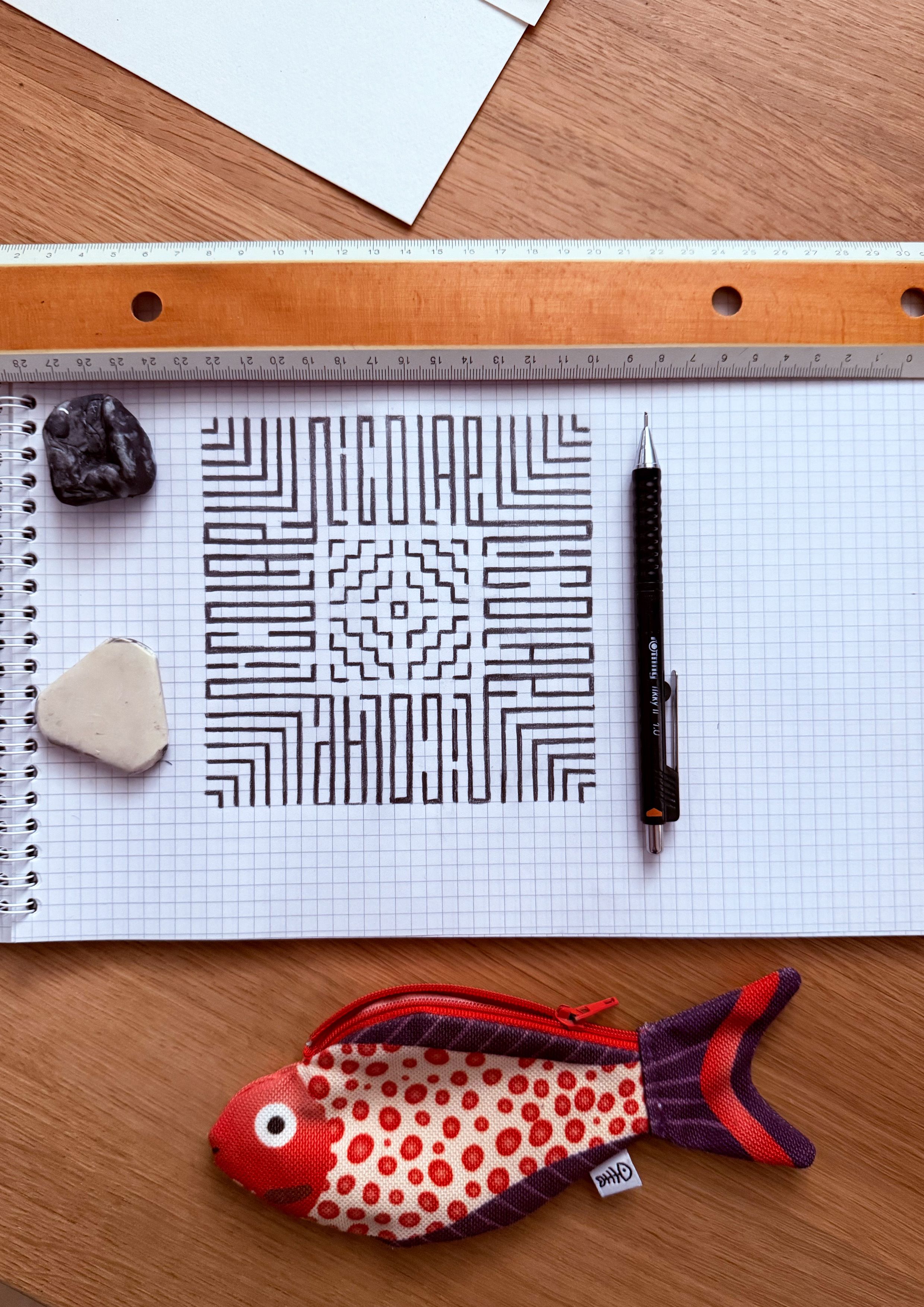 - Analog: Rotring Tikky II 1.0 mm, eraser, kneaded eraser, and a ruler for structural exploration on grid paper.