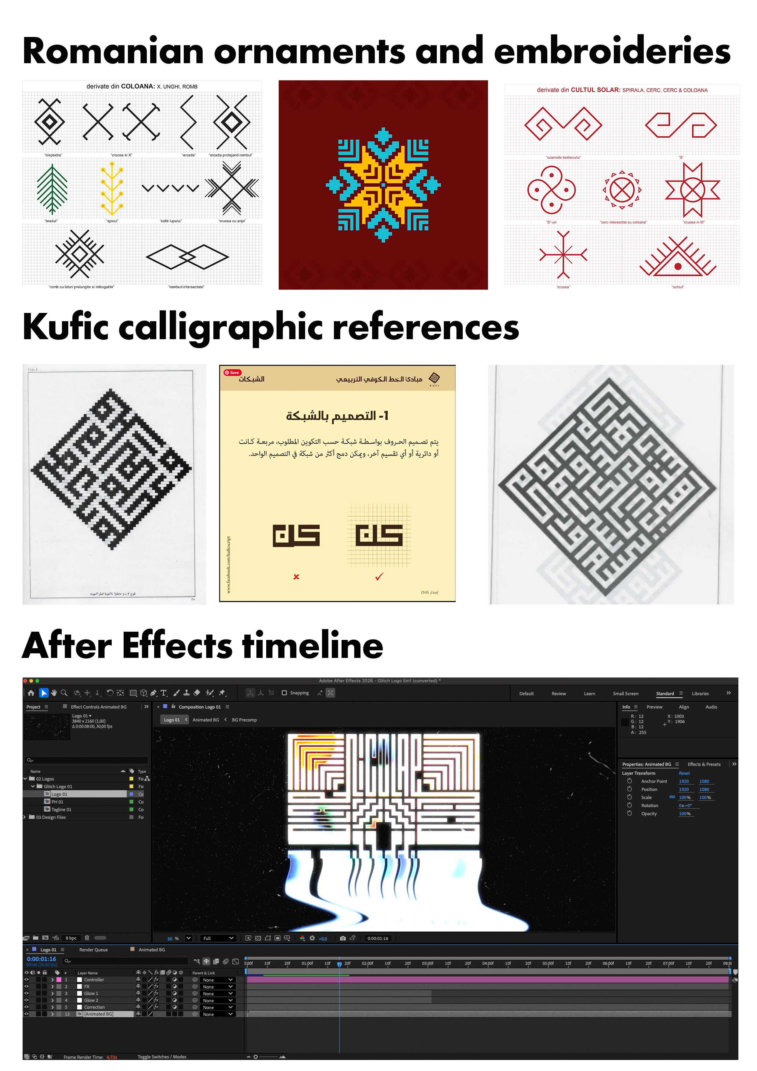 I began by analyzing the letters of my name to find a common geometric denominator. I experimented with the 90-degree angle of Kufic script, ensuring the stroke weight felt consistent with Romanian folk motifs. The sketches show the evolution from rough letters to a balanced, mirrored composition.
