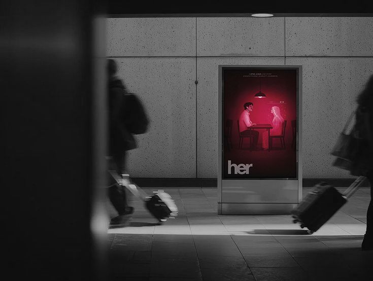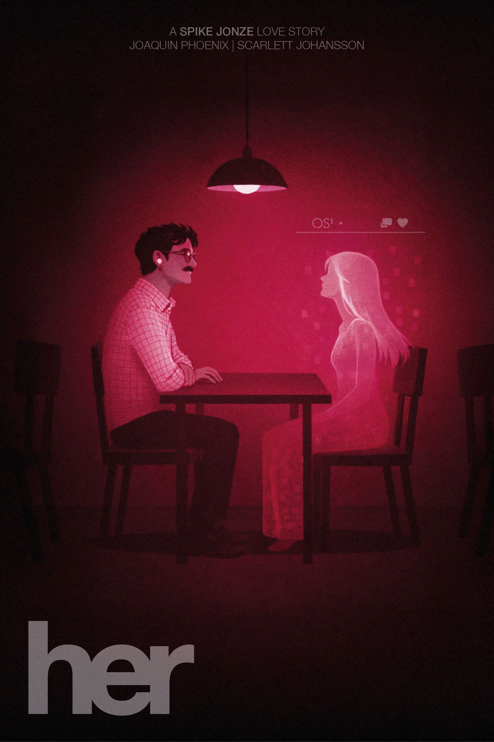 The key visual motif is emptiness-represented by the empty table, empty space, and the attention directed toward a non-existent presence. Theodore’s gaze and body language focus entirely on the hologram. Without it, he would be sitting completely alone. This absence is central to the composition and meaning of the poster.
