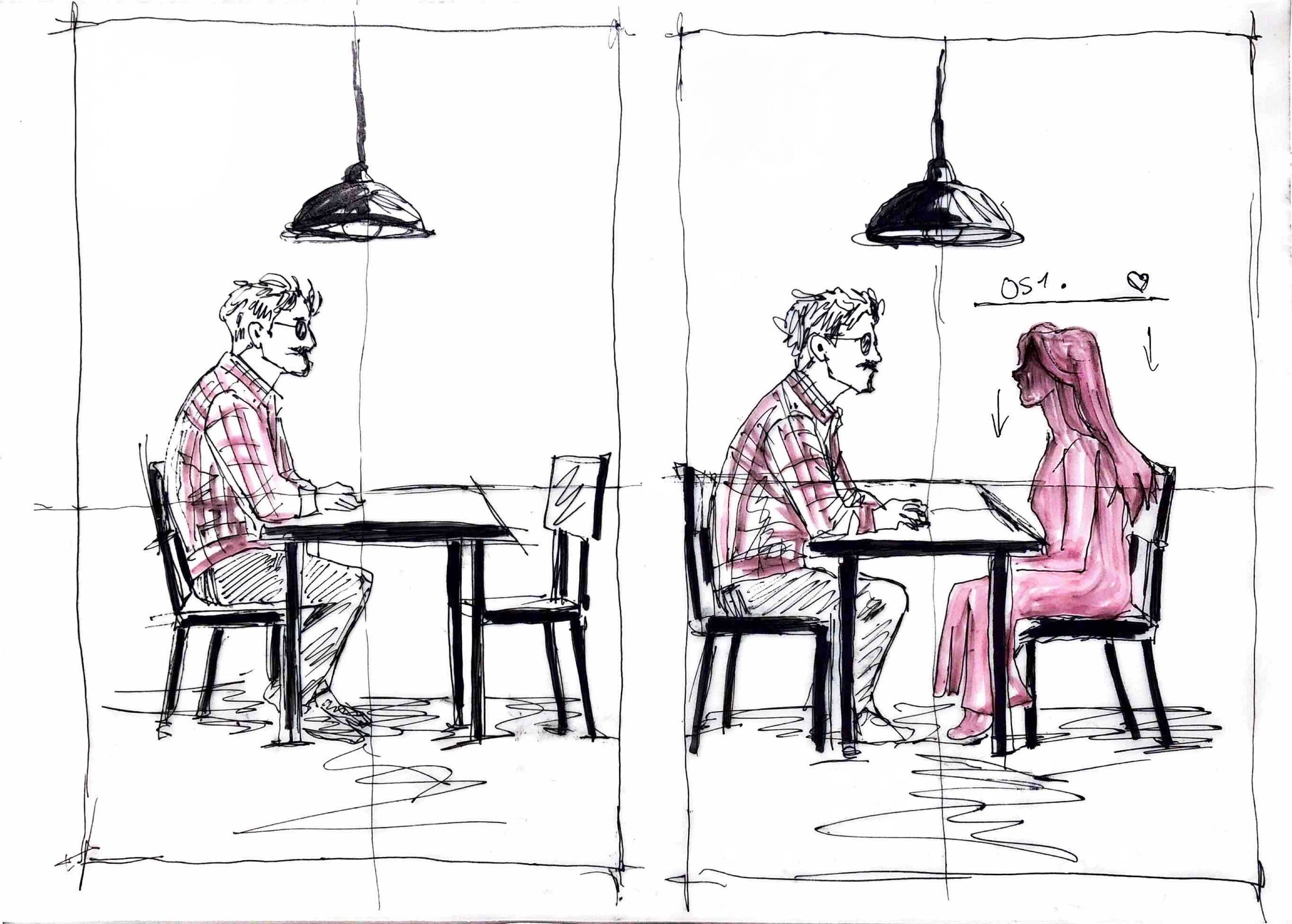 I then moved on to small compositional sketches. They allowed me to test the relationship between negative space and the figure, the direction of the gaze, and the impact of an intangible presence on the perception of the scene. Based on these sketches, the composition of the entire image emerged.