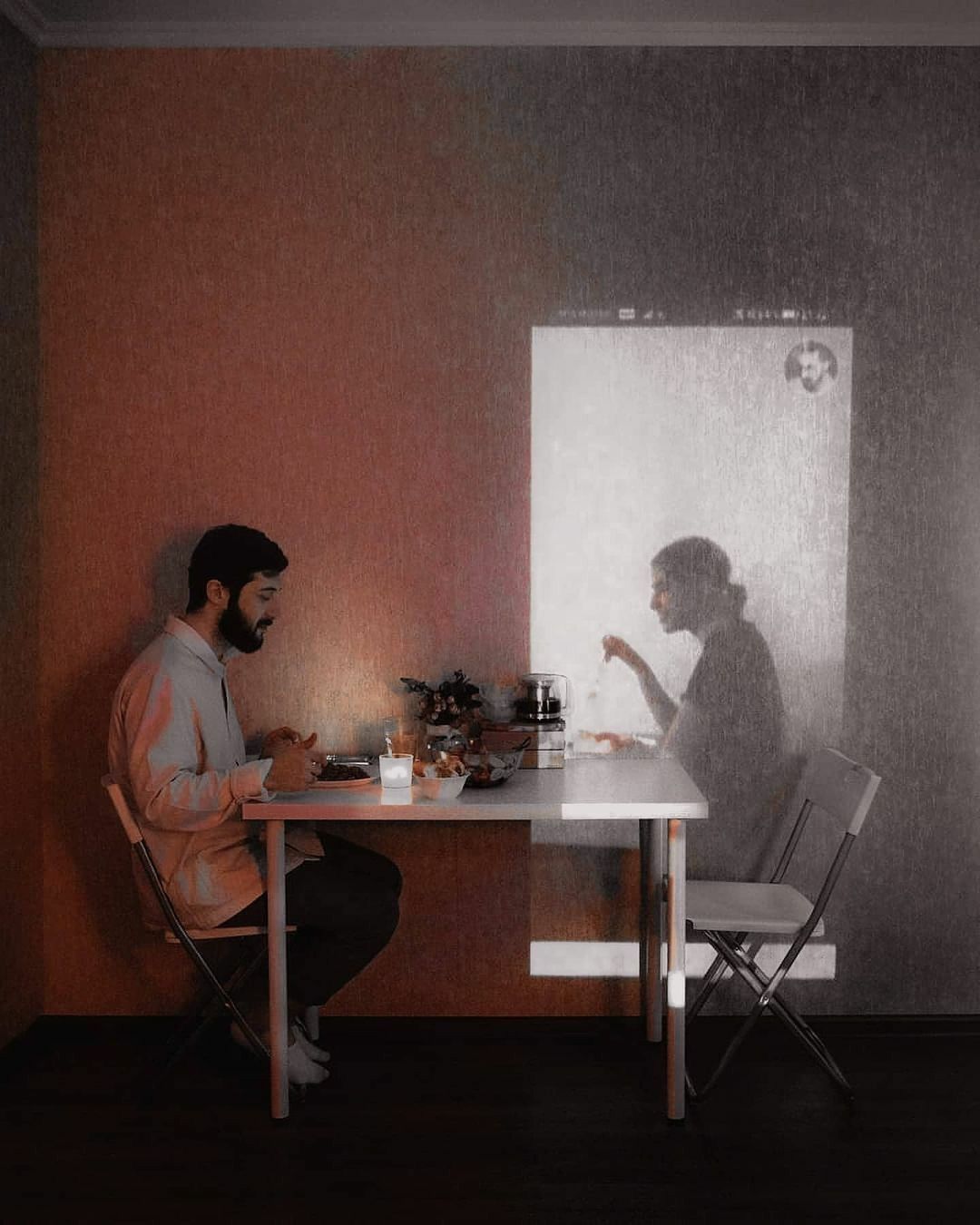 Seu conceito é fascinante, sim, mas à primeira vista parece ser sobre um fantasma. Não sei como explicar; talvez um close dele, ou dele deitado na cama conversando, também ficaria legal. Acho que a maior intimidade acontece na cama, conversando — bem, essa é só a minha opinião.